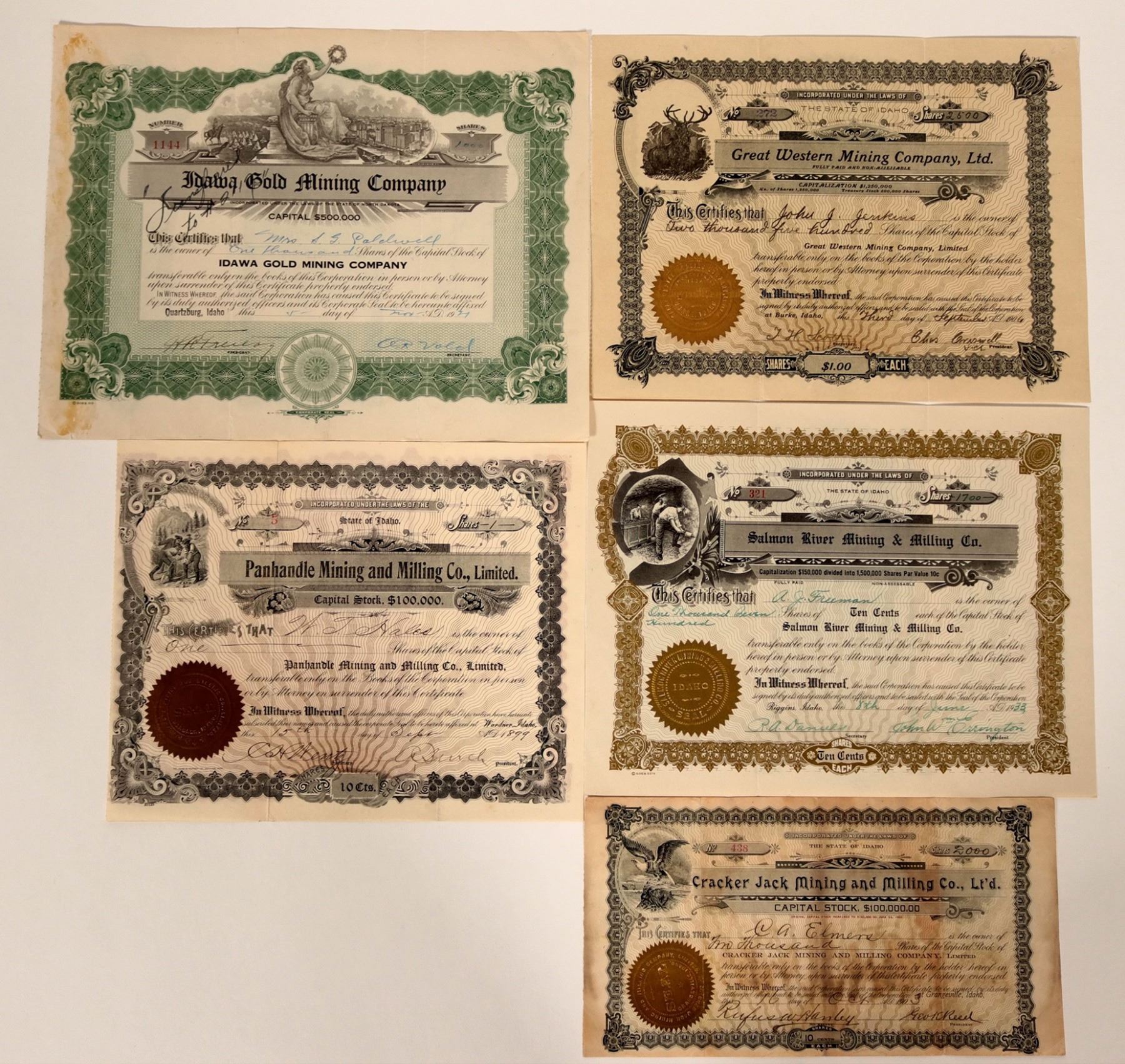 Lot of 5 different. Included: Great Western Mining Company, Ltd. (Burke, 1906, elk vignette); Panhandle Mining & Milling Co., Ltd. (Wardner, 1899, mining vignette); Salmon River Mining & Milling Co. (Riggins, 1933, underground mining vignette); Cracker Jack Mining and Milling Co., Ltd. (Grangeville, 1903, eagle vignette); and Idawa Gold Mining Company (Quartzburg, 1921, allegorical vignette). City: State: Idaho Date: 1899-1933