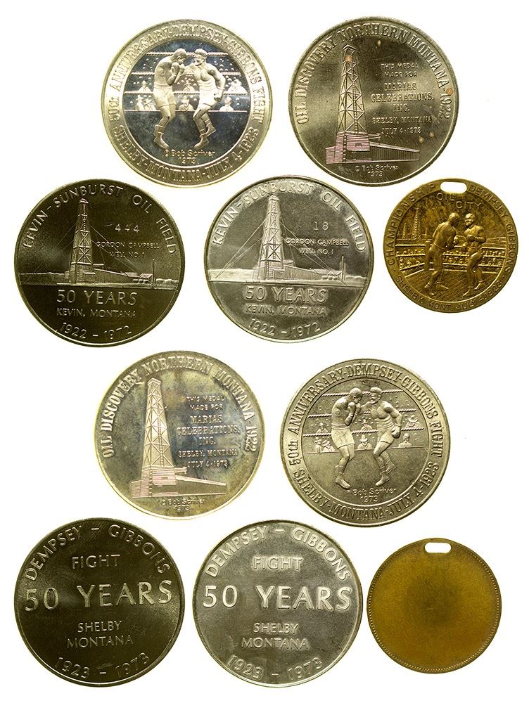 Five So Called Dollars, 2 are silver, 3 Dempsey-Gibbons fight pieces, 2 Kevin Sunburst Oil Field. (Svoboda Collection) City: State: Montana Date: HWAC# 35949