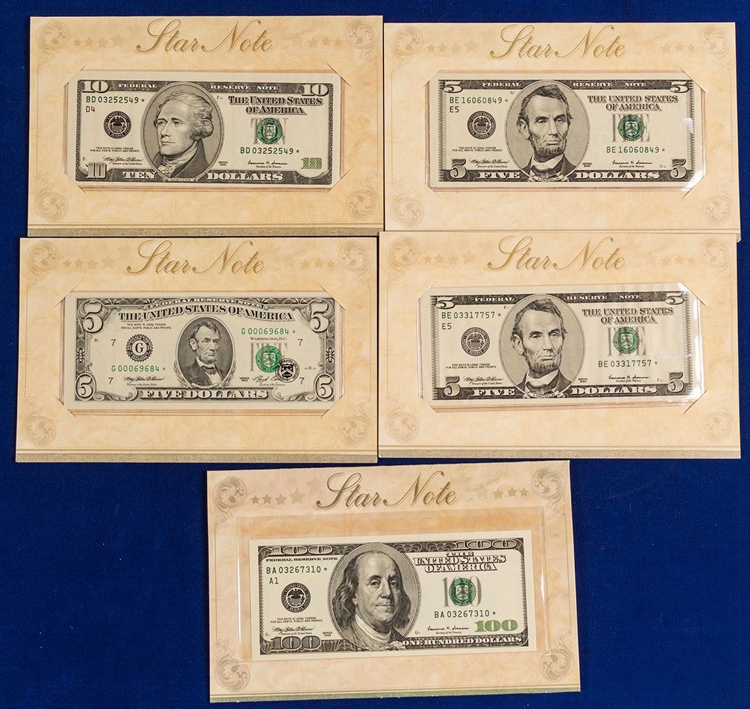 Group of five Star Notes, $100- 1999 series, BA * un CU; 1999 series $10, BD* in CU, two 1999 series $5, BE* in CU (both); 1993 series $5 G* with low sn G00069684 Date: Location: HWAC# 58214