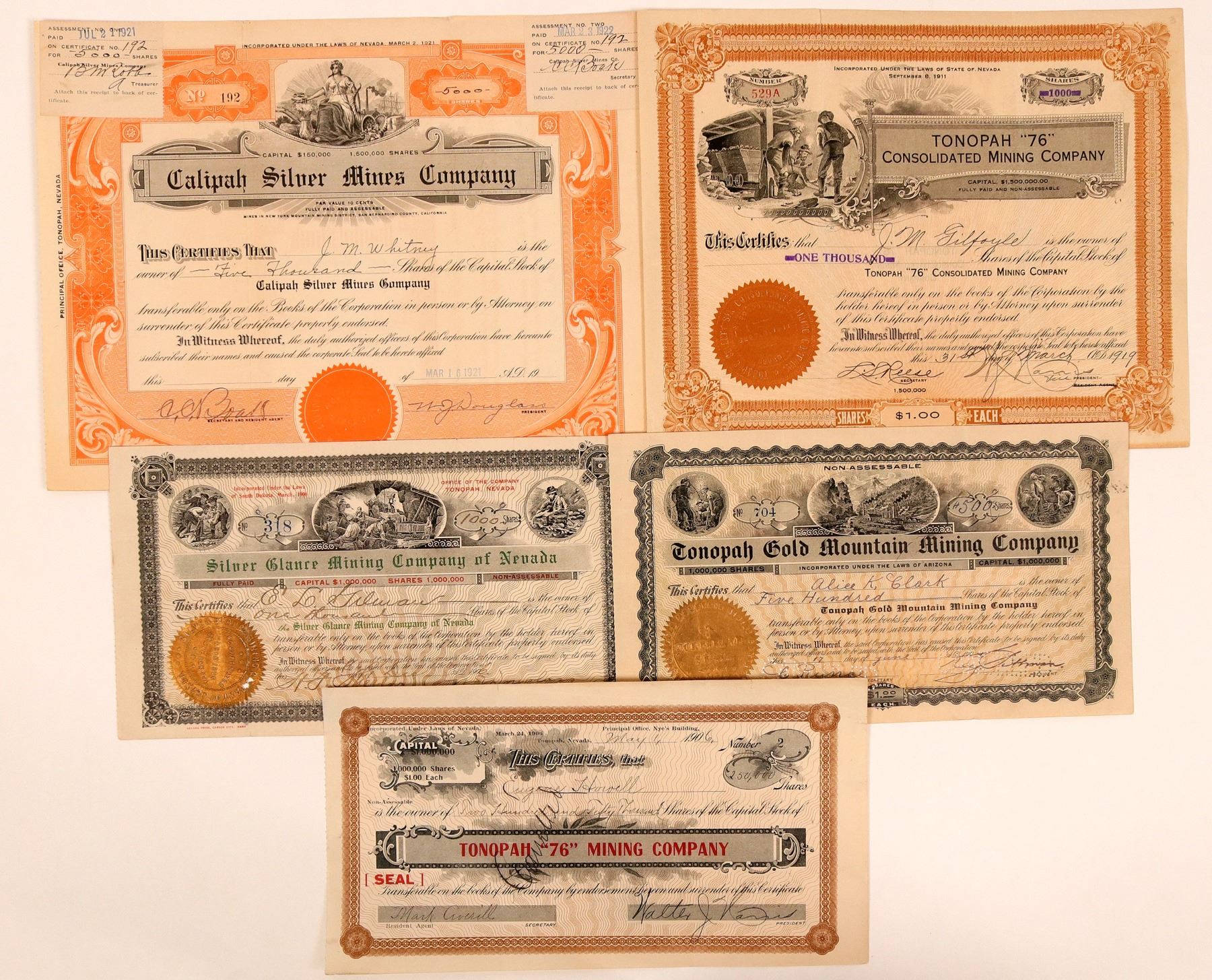 Lot includes Tonopah Gold Mountain, signed by Key Pittman; Tonopah "76" Mining Company, signed by Walter J. Harris (Tonopah Banker); Tonopah "76" Cons. Mining Co., also signed by Harris; and two signed by W.J. Douglass, Silver Glance M.C. of Nevada and Calipah Silver Mines Co. Douglas was a prolific mining man involved with many companies including the Tonopah Midway and the Silver Glance. This is a nice group of scarce Tonopah.