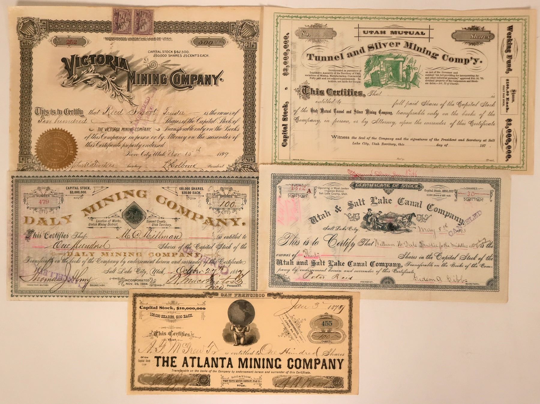 Mixed group of issued, unissued and canceled mining stock certificates from Utah. Includes Daly Mining Company, 1887, with gilt lettering, canceled; The Atlanta Mining Company, 1879, issued, not canceled, vignette of man holding the earth; Tunnel and Silver Mining Comp'y, unissued, 1870's, pristine; Victoria Mining Company, transfer stamps, 1899; and Utah & Salt Lake Canal Company, 1893, signed and canceled. For more detail, see photo.
