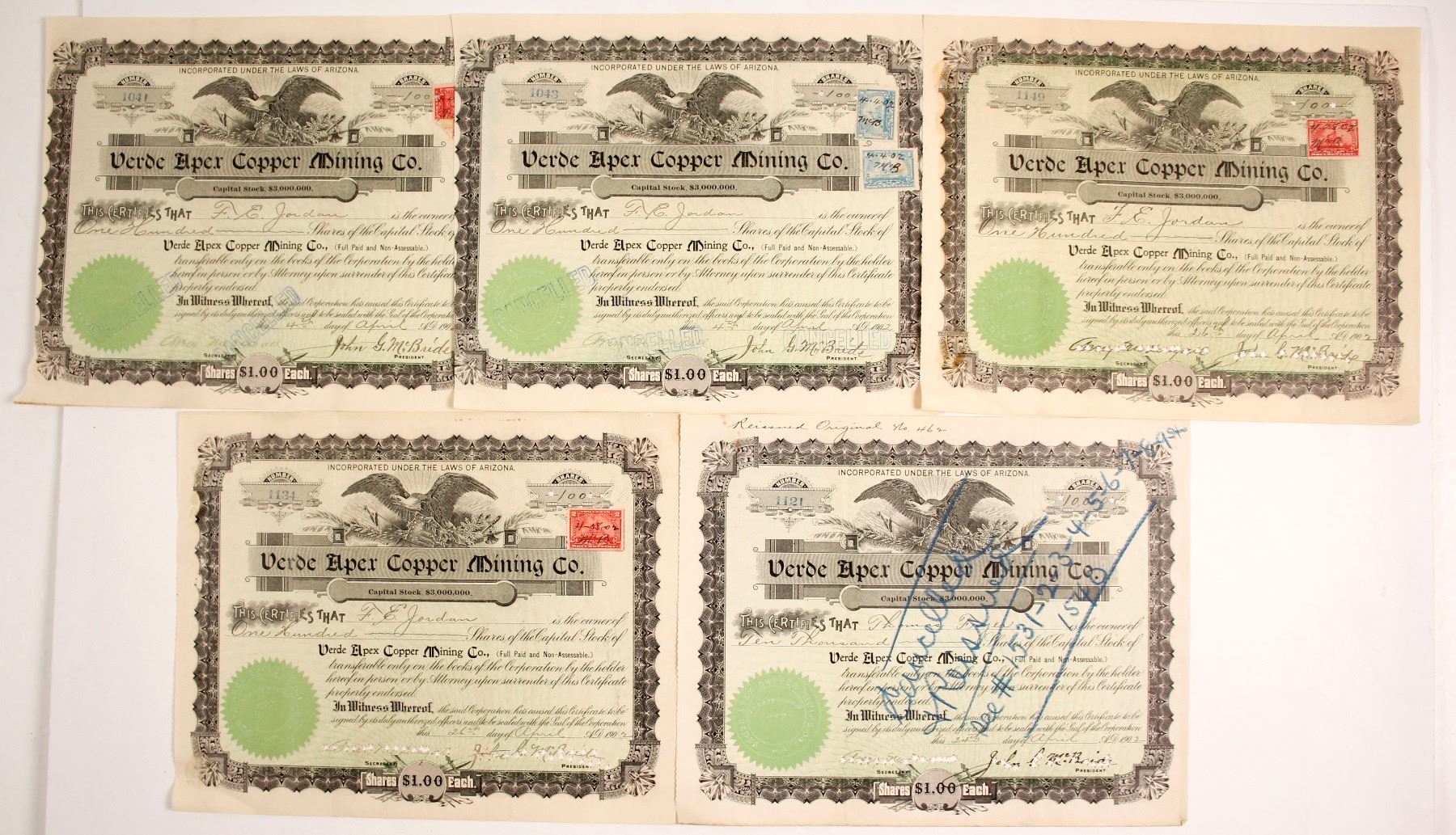 Lot of 5 issued and cancelled stock certificates, 1902. All have an identical design with a black border, green background, and eagle vignette. Says Inc. in Arizona. This was a scam by Joseph Weil and Fred Buckminster. The 1906 Mines Register lists it as having an office in Jerome, 6 claims, 90 acres, in Mescal Gulch, but "out of funds and may lose lands." Date: 1902 City: Jerome State: Arizona HWAC# 77525