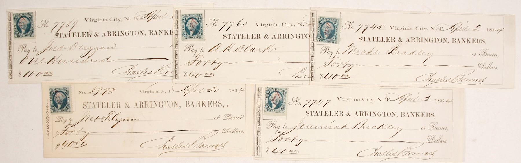Lot of 5 Stateler & Arrington checks signed by Charles Bonner as superintendent for the Gould & Curry Mine. Each check is issued to a miner whose profession was confirmed by the 1864 Collins Comstock directory. Each check is cut cancelled with an adhesive revenue stamp. City: Virginia City State: Nevada Date: 1864
