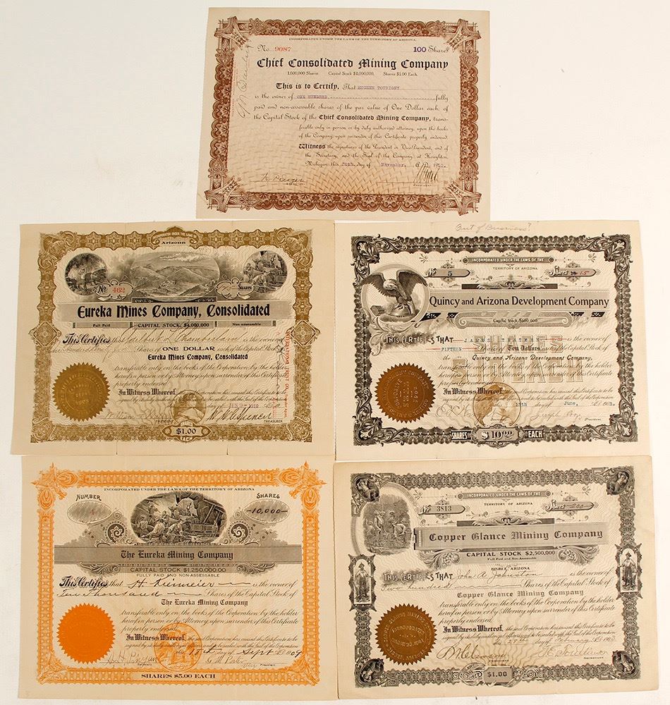 1) Eureka Mining. 1909. NUMBER 4 for 10,000 shares. To Kiemeier(?). 2) Quincy & Arizona. NUMBER 5 for 15 shares. 1903. 3) Copper Glance., 1903. 4) Eureka Mines Consolidated. 1910. Large rips at bottom folds. 5) Chief Consolidated 1910. (Laguna Collection) HWAC# 62973 Date: Location: Bisbee, Warren, Arizona