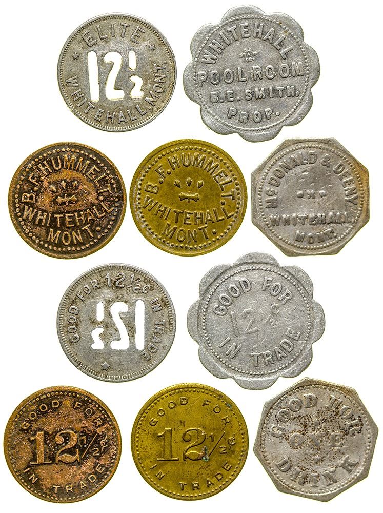 1)Two tokens: B. F. Hummelt / Whitehall / Mont. // GF / 12-1/2c / IT. Round, brass. 2) McDonald & Deeny / Whitehall / Mont. // GF / One / Drink. Octagonal, aluminum. 3) Whitehall / Pool Room / B. E. Smith, / Prop. // GF 12-1/2c / IT. 4) Elite / 12-/1/2 / Whitehall, Mont. // GF / 12-1/2c / IT. Round, aluminum, cut-put "12 1/2". (Svoboda Collection) City: Whitehall State: Montana Date: HWAC# 35731