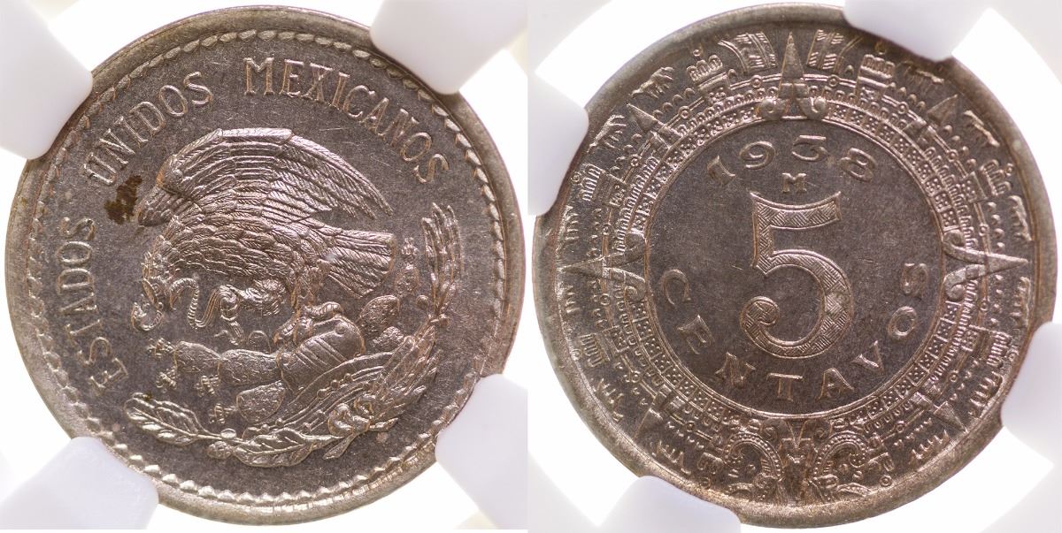 KM # 423, copper-nickel, 20.5mm. Rare date. MS 64. State: Mexico City: Date: 1938 FHWAC#: 40669