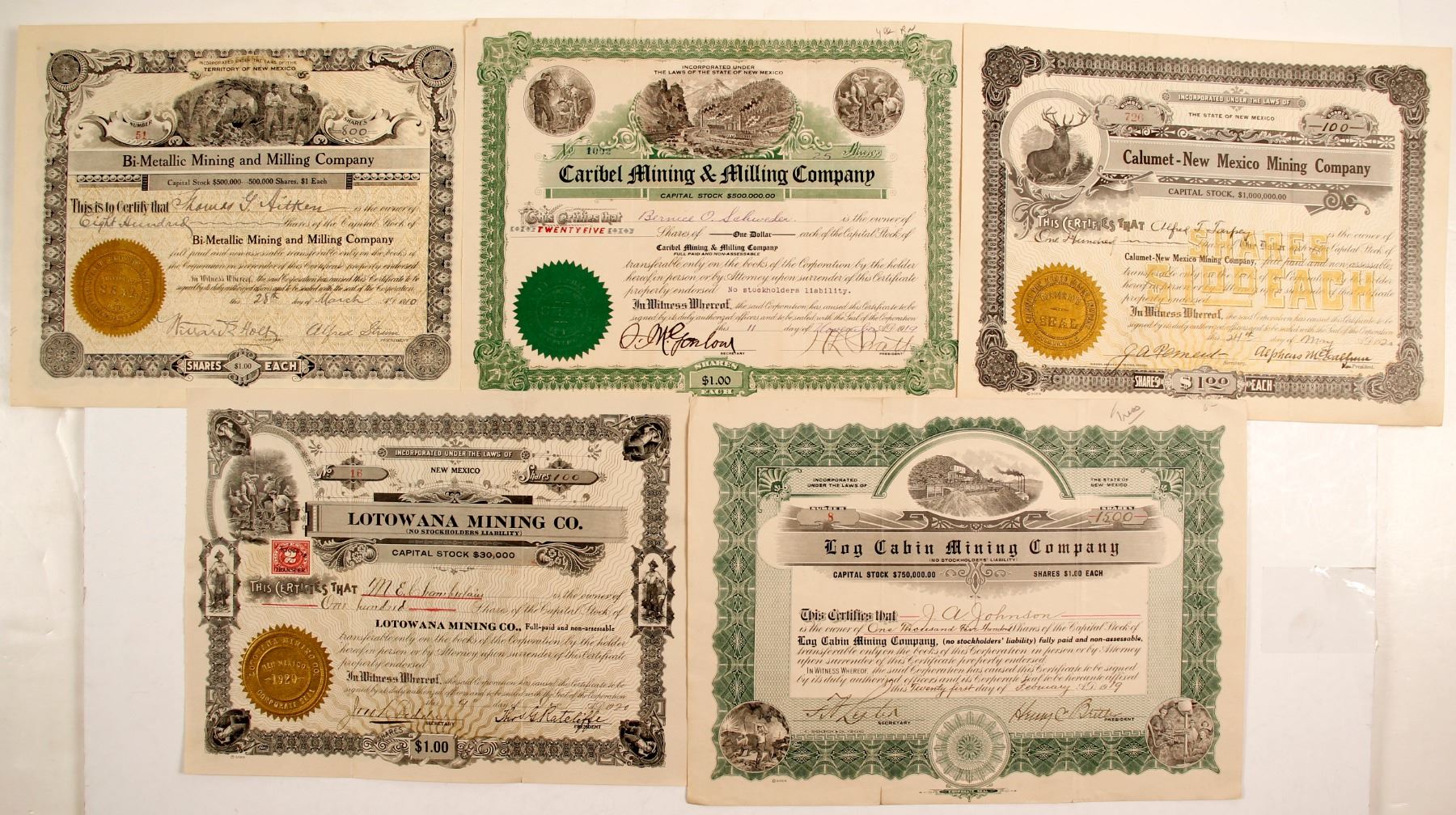 Five New Mexico capital mining stock. 1) Twenty-five shares of Caribel Mining & Milling Company, number 1092, issued to Bernice O. Schweder on November 11, 1919. Printed: GOES. 2) Eight hundred shares of Bi-Metallic Mining and Milling Company, number 51, issued to Thomas G. Aitken on March 28, 1910. 3) One hundred shares of Calumet -New Mexico Mining Company, number 726. issued to Alfred T. Tarpey on May 24, 1920.Printed: GOES. 4) One hundred shares of Lotowana Mining Co. number 16, issued to M. E. Chamberlain on December 9, 1920, revenue stamp, signed Thos G. Rateleffe. president.Printed: GOES. 5)Fifteen hundred share of Log Cabin Mining Company, number 8, issued to J. A. Johnson on February 21, 1919. Printed: GOES. Assigned by J. A. Johnson. Ken Prag Collection. State: New Mexico City: Date: HWAC# 82331