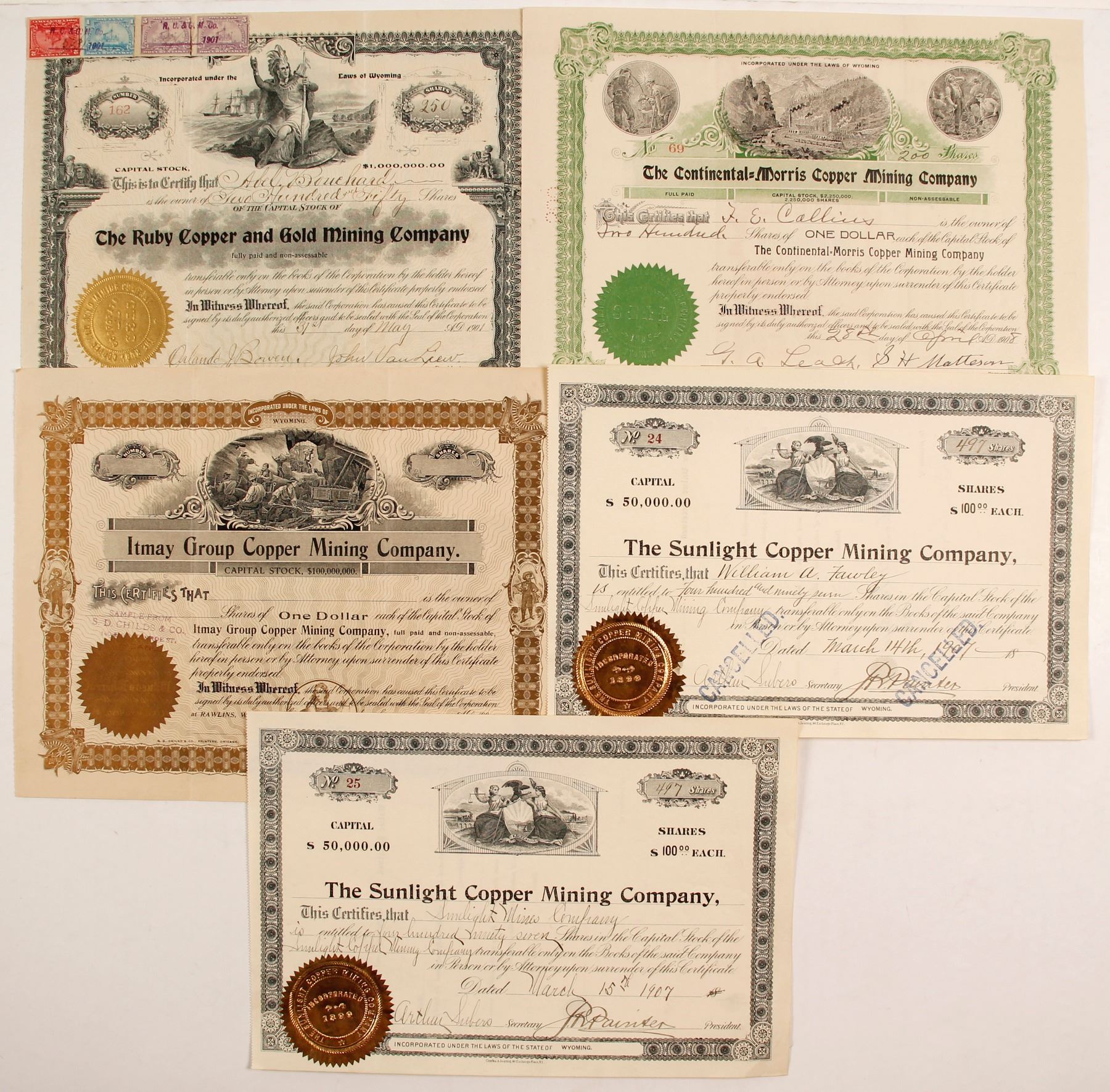 Five shares of stock from Wyoming - early 1900's. 1) Two hundred fifty shares of Ruby Copper and Gold Mining Company, number 162 issued to Abel, Bouchard, dated May 31, 1901. with revenue stamps. Vignette of Indian. Signed by John Van Liew, president and Orlando J. Borwen, secretary. Printed: Steeluth. 2) Cancelled 497 shares of Sunlight Copper Mining Company, number 24 issued to William A. Fawley, issued March 14th, Vignette of two women with scale and eagle. Printed: Charles A. Searing. 3) Four hundred ninety-seven shares of Sunlight Copper Mining Company, number 25 issued to Sunlight Mines Company, signed Jr. R. Painter, president and Arthur Subers, secretary.Vignette of two women with scale and eagle. Printed Charles A. Searing. 4) Two hundred shares of Continental-Morris Copper Mining Company, number 69 issued to F. E. Callius dated April 28, 1908, signed by S. H. Matteson, president and G. A. Lealh, secretary. Three vignettes, two miners, one mining building. 5) Unissued share of Itmay Group Copper Mining Company. Vignette miners working. Printed: D. Childs & Company. Ken Prag Collection. State: Wyoming City: Date: HWAC# 81829