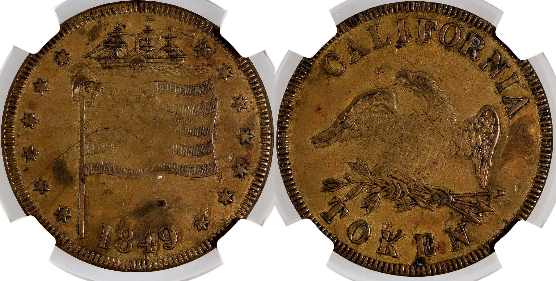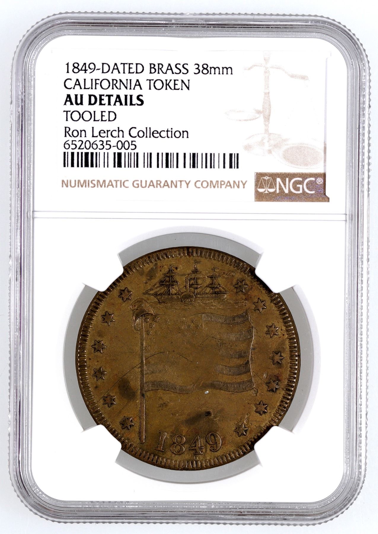 NGC certified AU Details Tooled from the Ron Lerch Collection. 1849 dated brass, 38 mm California gaming counter token. Flag and steamship obverse; California token / spread eagle reverse. 1849
