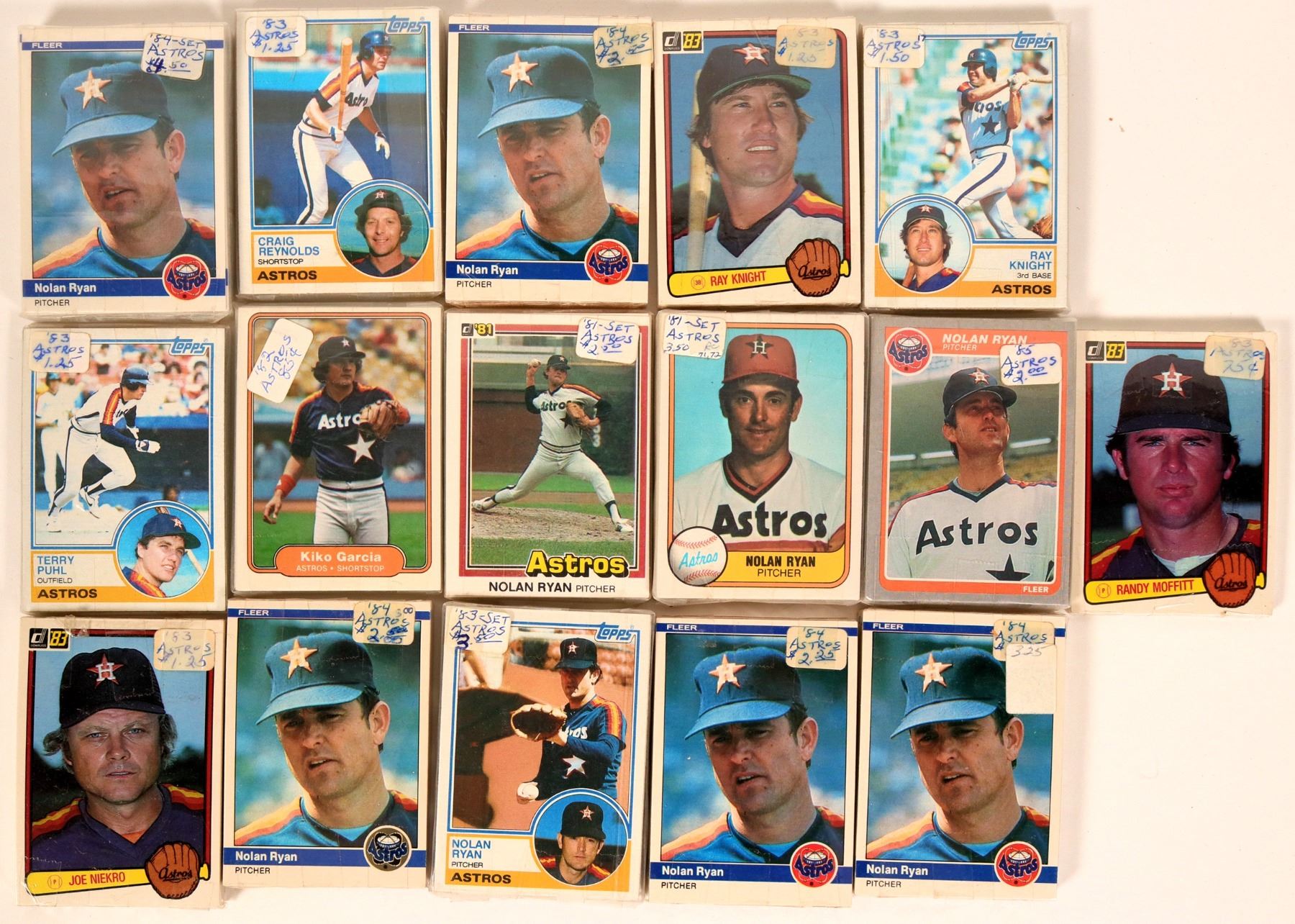 This is a lot of Astros baseball cards from the 1983 season. Approximately 350-400 cards in 20-30 count bags. Names like Randy Moffitt and Craig Reynolds appear. NM.