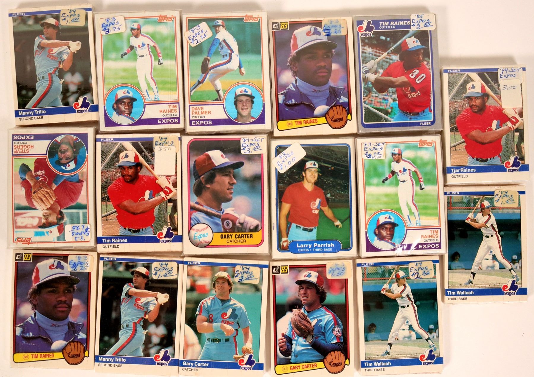 This is a lot of 400-450 baseball cards for the Expos 1985 season. Names like Tim Raines and Ray Burris appear. Packaged in bags of 20-30 each. NM.