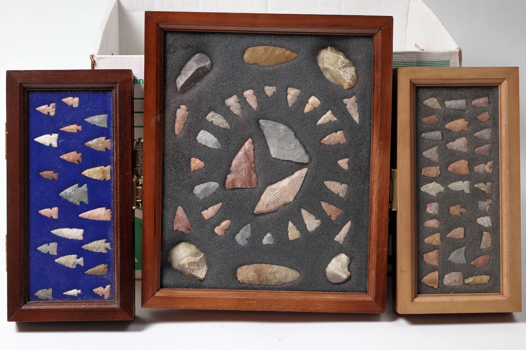 This collection of bird points number about 120. One walnut box of 20 incudes side notches with one very beautiful pink corner tang notch that appears to have been made that way; from Chautauqua County, Kansas. A second box of bird points are largely partials at 31 pieces. A third box has 39 pieces that include two drills. A fourth box has bird points and tools from Kay Co., Oklahoma. Please see photos for details. From the Bracken collection. Provenance: Gary Bracken Collection