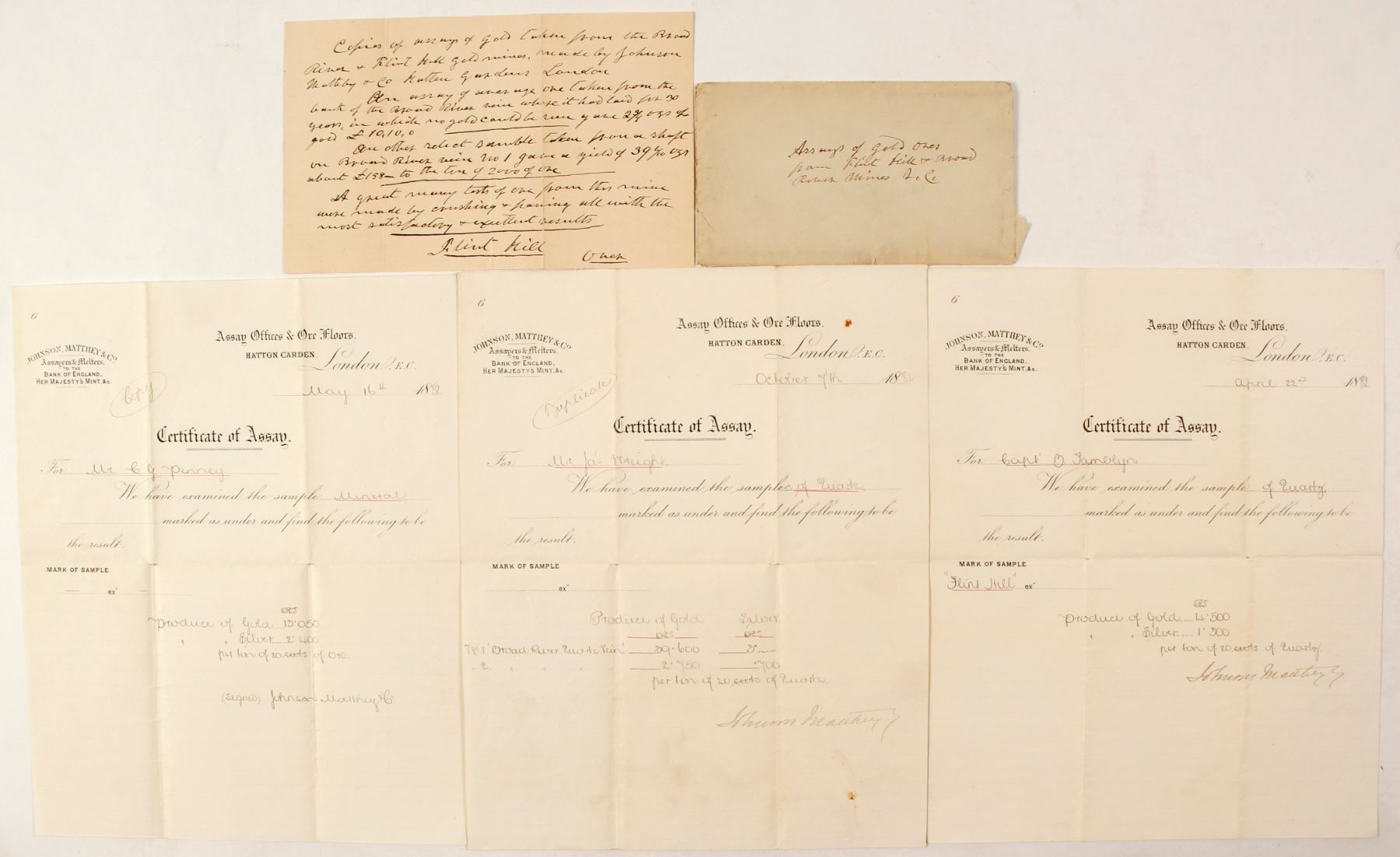 Three assay reports from the London Assay Office of Johnson, Matthey & Company of Hatton Garden in London. Assays were fro. Flint Hill, Broad River Quartz Vein and undetermined. Sent to Captain B Tamblyn, CG Penney, and James Wreight(?). The Flint Hill Mine was located near Gaffney in Cherokee County. Includes a note about the assays. It is unusual to have an English assay report. State: South Carolina City: Gaffney Date: 1882 Al Adams Collection. HWAC# 57090
