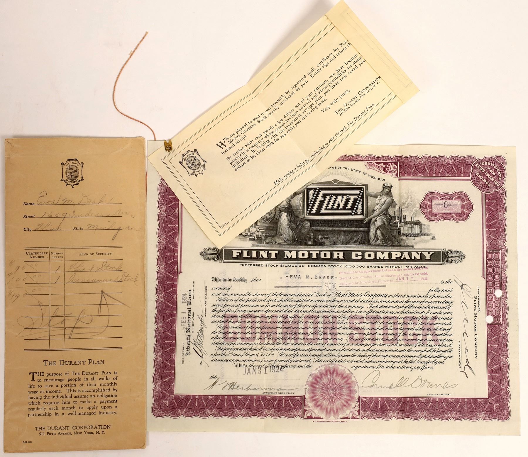 Number 16452 for 6 shares. Comes in original envelope. Advertises the Durant Plan where people invest a few dollars a month as a way to save for the future. The company produced their first car in 1923 and was out of business by 1927. Flint Motors was a wholly owned subsidiary of Durant Motors Company.