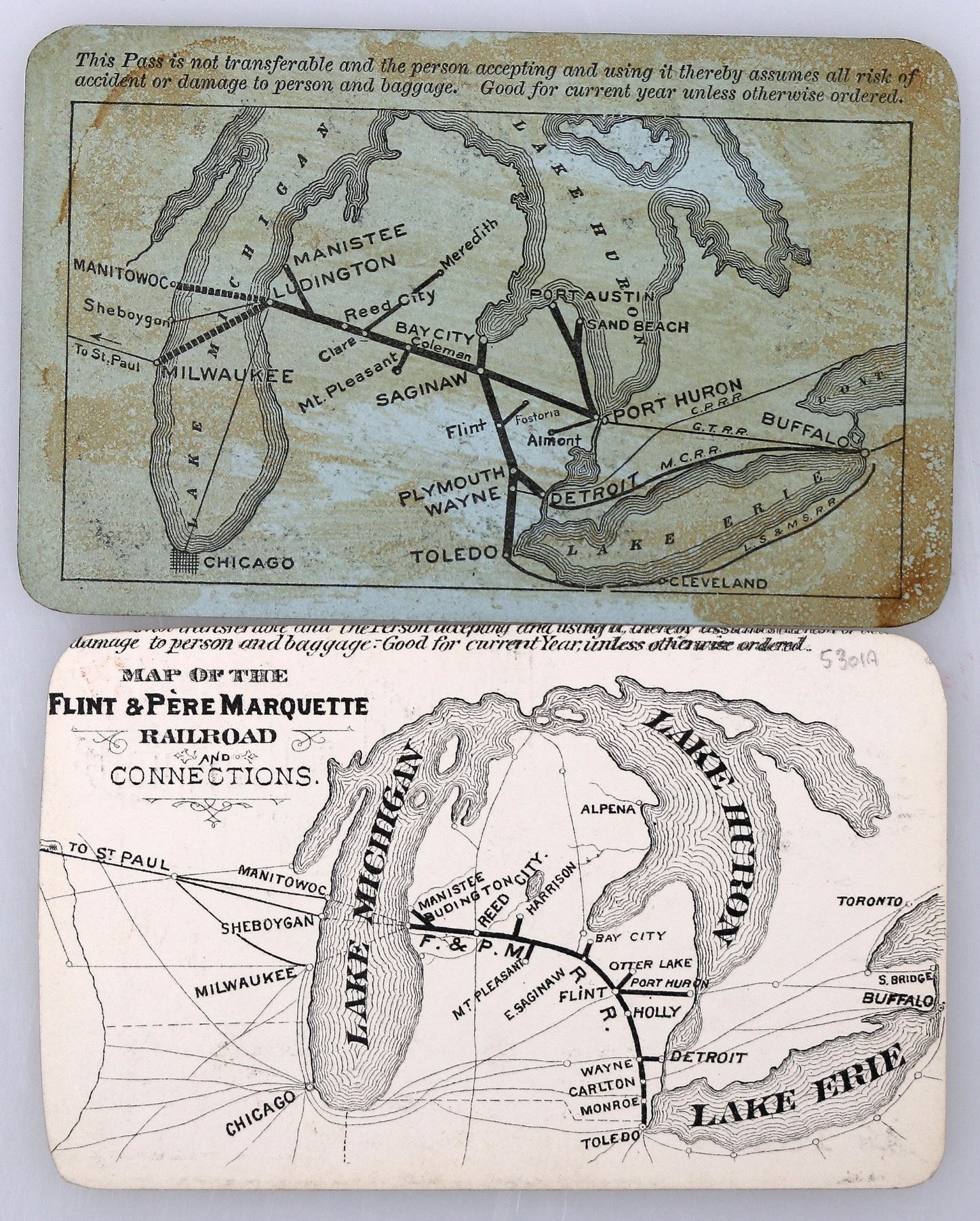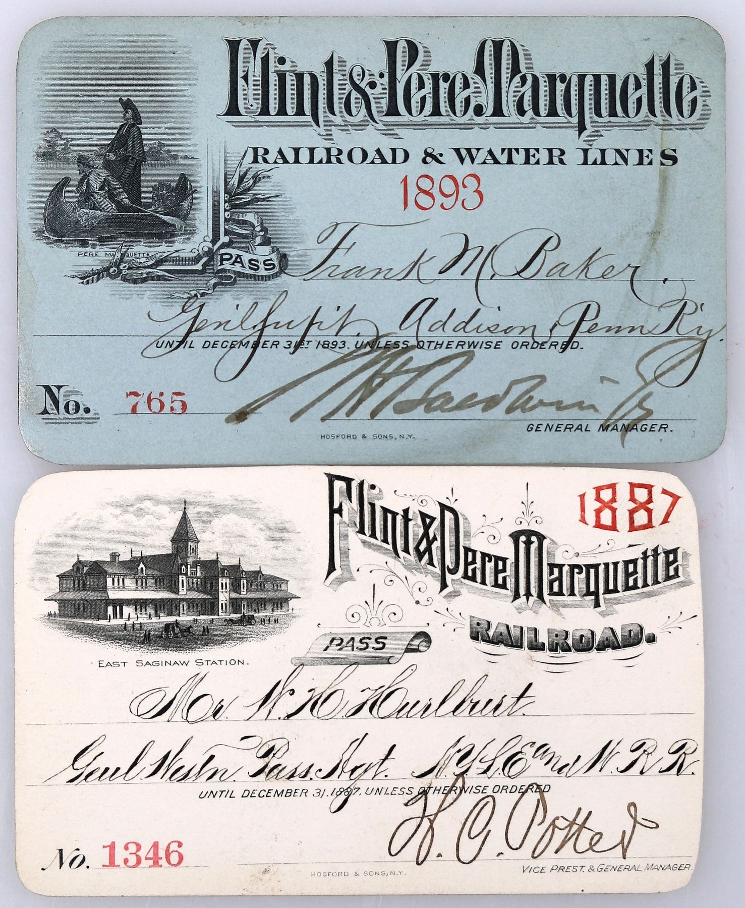 Lot of 2 different. 1) 1887 pass to Hurlburt. Signed by vice president and general manager HC Potter. Vignette of East Saginaw Station. Map of route on reverse! White cardstock. 2) 1893 Railroad & Water Lines pass issued to Frank Baker. Signed by the general manager. Vignette of Pere Marquette exploring in a canoe. Reverse has a different map. Adhesive residue. Blue cardstock The F & PM was chartered in 1857 to build a line from Flint to Lake Michigan. As we can see by the map on the reverse of the pass, by 1896 the line ran from Ludington on Lake Michigan to Port Austin on Lake Huron and Detroit on Lake Erie. It also offered steamship service across Lake Michigan to Milwaukee.