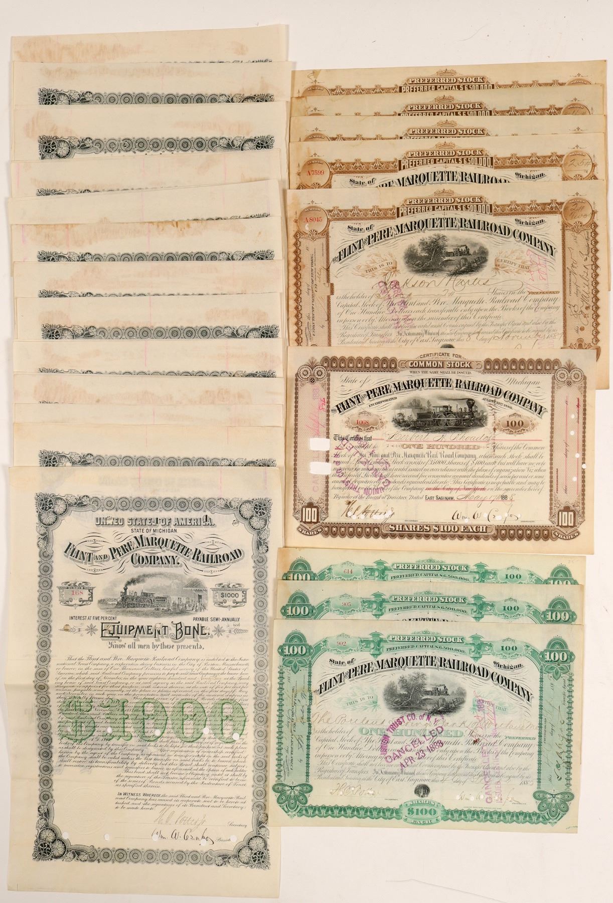 22 total certificates, 9 stock and 13 bonds. Incorp 1880 Michigan 1. Three Preferred stocks #614, 902, 905, I/C, 100 shares $100 par issued 1881-1885. GREEN, Vignette top 4-4-0 crossing stone bridge l-r, dog on bottom. American Bank Note Co.. 2. Five Preferred stock # A7599,7602,7818,8044,8045 and one common stock #1068, I/C, number shares vary, $100 par, issued 1889, BROWN, vignette 4-4-0 crossing bridge. American Bank Note Co.. 3. Thirteen Bonds #168, 172, 330-333, 352-53, 356, 358-59, 362-63, I/C, $1000, 5%, Equipment bearer bonds due 1892-97. Issued Nov 1, 1887. Signed Wm. A. Czaba President. BLACK, embossed seal, vignette American 4-4-0 @ depot, $1000 green underprint. Unknown printer. Various condition VF + Ken Prag Collection