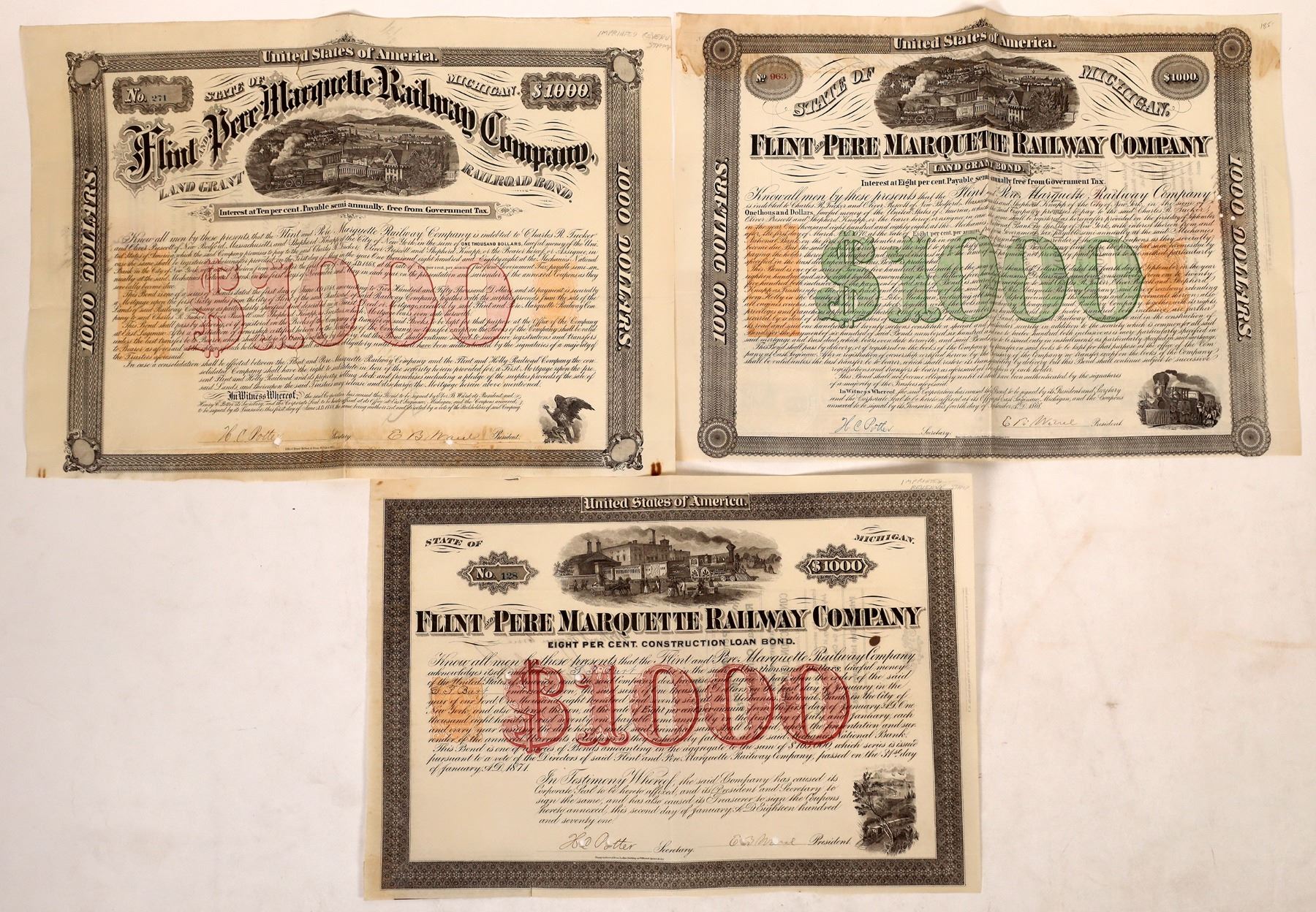 Flint and Pere Marquette Railway Bonds, 3 Different Colors [176938]