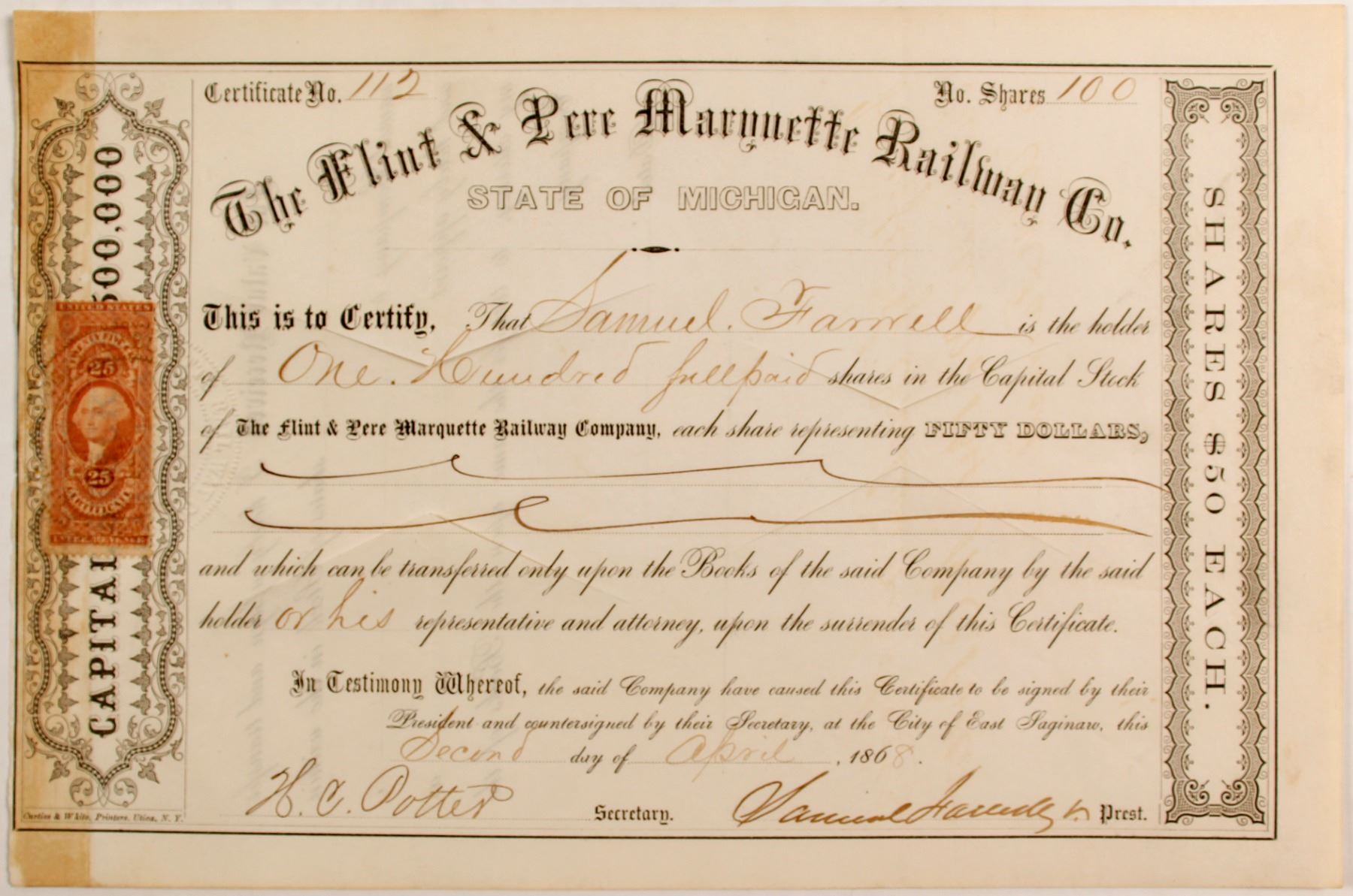 Issued cut cancelled #112 Samuel Farrell 100 shares 1868 signed by President Farrell. 25c revenue stamp. Left toning. Prag collection.