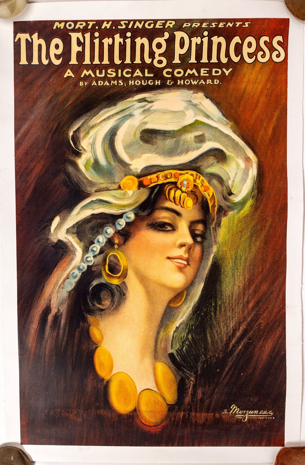 "Mort H. Singer Presents The Flirting Princess, a musical comedy, by Adams, Hough & Howard." "The Morgan Litho Co, Cleveland, Ohio, USA 12387." 42.5 x 28.75, professionally mounted on canvas, immaculate conditions and bright colors. The play premiered at the Princess Theatre in Chicago in 1909. This very rare poster is exquisite!