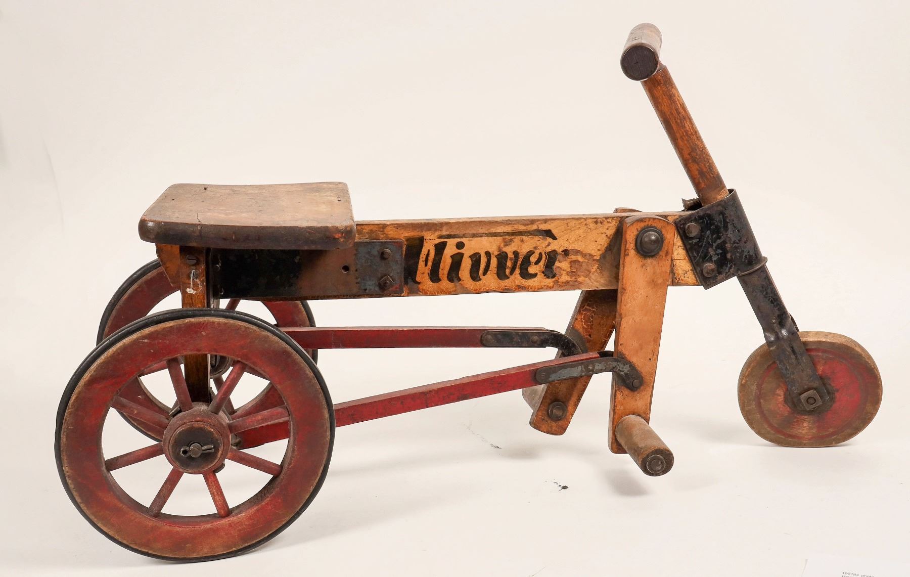 This wood and metal peddle trike was made by The Automatic Cradle Manufacturing Company. The trike measures 18"x 26" and can still be used or displayed. Please see photos for more details.
