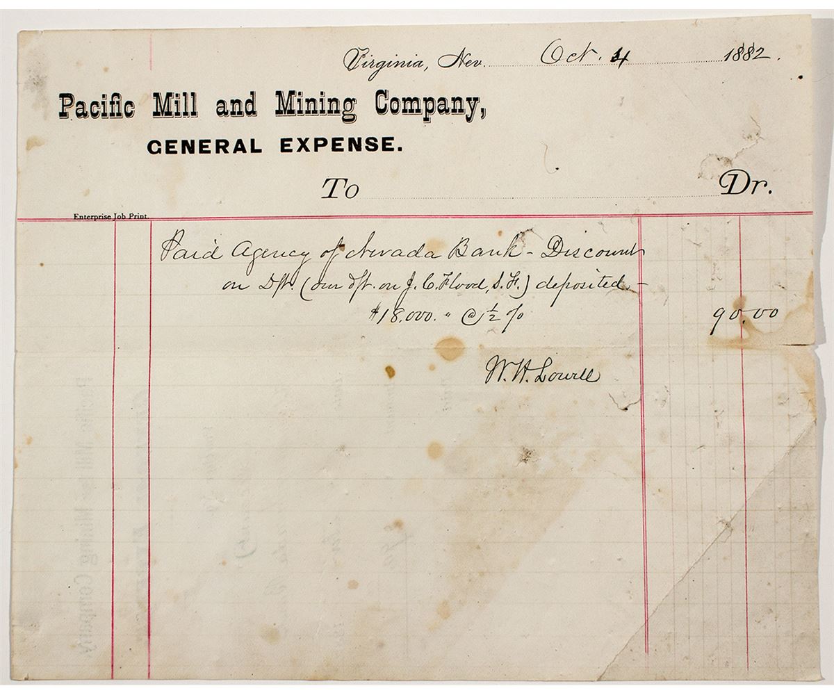 An interesting voucher for a discount on buffer by J.C. Flood paid to the "Agency of Nevada Bank." The sum of $18,000.00 dollars was deposited, at 1/2 %. The voucher is signed by M.H. Lowell. This document has a minor tear, a few tiny wear holes, and age stains. James Clair Flood was one of the Comstock "Bonanza Kings," an icon of Virginia City mining history. He was one of the partners in the famous Consolidated Virginia Mining operations. An Enterprise Job Print of Virginia City.