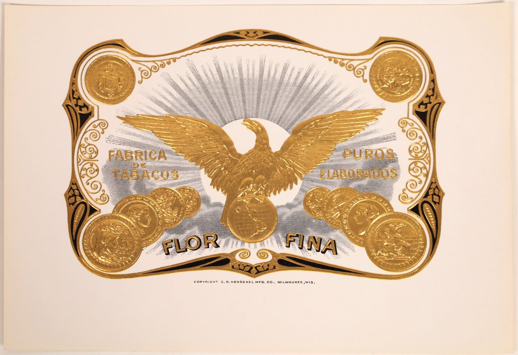 Gorgeous gold lithography with an eagle sitting on top of the world and ten gold coins around the vignette. Mint condition. "Fabric de Tabacos / Puros Elaborados". Made by C. B. Henschel Mfg. Co., Milwaukee, Wisconsin 9 x 7 inches.