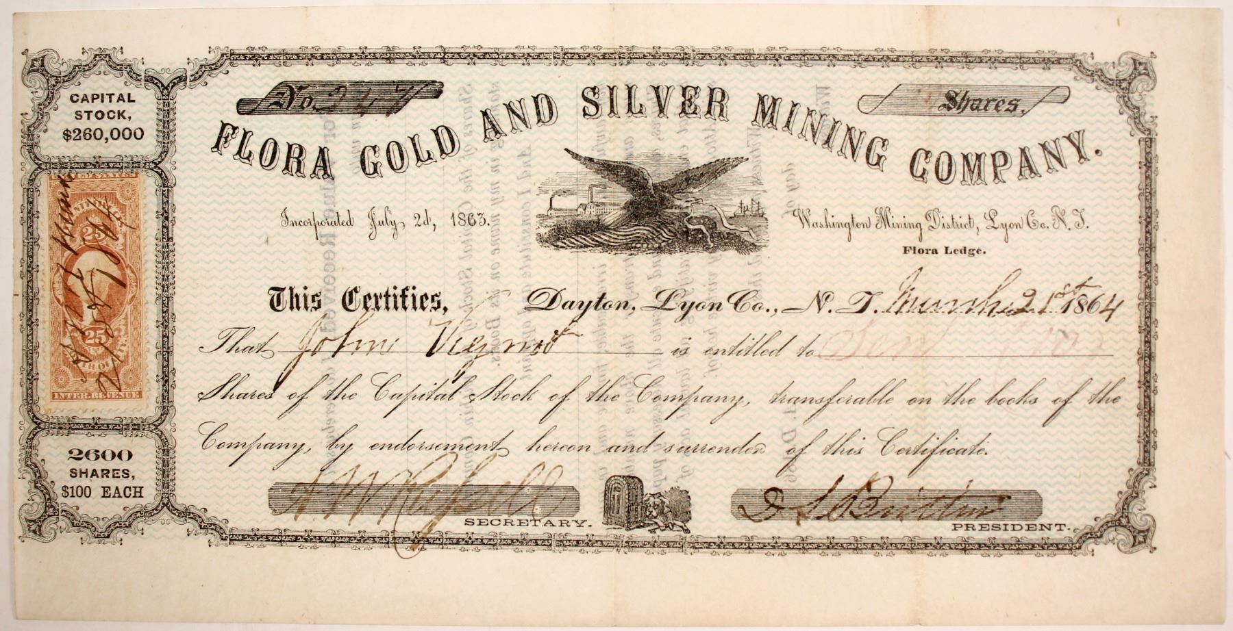 # 247 for 10 shares to John Vignot. Signed by AW Russell and president DS Brittin. Dateline Dayton, Lyon Co., N. T. March 21, 1864. Incorporated July 2d, 1863. Not cancelled. 25c Power of Att'y Revenue stamp. Eagle and flag vignette. No printer listed. Location: Washington Mining District, Lyon Co., N. T. Listed in Collins. John Vignot's cabin built in 1859 was one of the first four or five substantial buildings at Gold Hill. In 1861 he and three others, Including McLaughlin, surveyed the area around Gold Hill for water. L William Donaldson, WW Caperton and the Ophir Mining Company on August 12, 1861 sold land with water privileges and mill sites between Virginia City and American Flat to the Washoe Turnpike Company.Russell was the county recorder for Lyon and Churchill counties at this time. District located along the canyon of the East Walker River in the southeastern corner of Lyon County, extending from the vicinity of Wichman Canyon on the north to the Mineral county line on the east and the south. Most of the district is in Lyon County. [MIning Districts of Nevada by Tingley] Prag Collection State: Nevada City: Washington Mining District (Lyon County) Date: 1864 HWAC# 84566