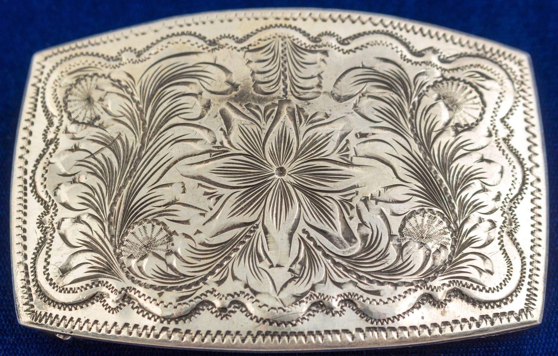Rectangular planchette with beautifully etched western floral patterns (plants, vines, flowers). Emphasis on centered intricately etched flower in center of buckle. Etched with a stitched like border. Belt buckle is sterling silver. WEIGHT: 58.6 grams. SIZE: 3.5 x 2.25". In excellent condition. Stamped on back "KK Kustom Kraft" State: City: HWAC#: 48216 Date: