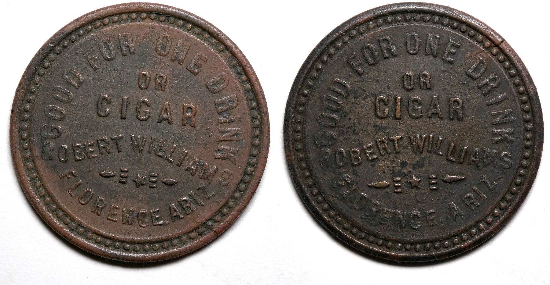 G.F. One Drink/Or/Cigar/Robert Williams/Florence/Ariz.//G.F. One Drink/Or/Cigar/Robert Williams/Florence/Ariz. Rd., Br., 27mm., R-9