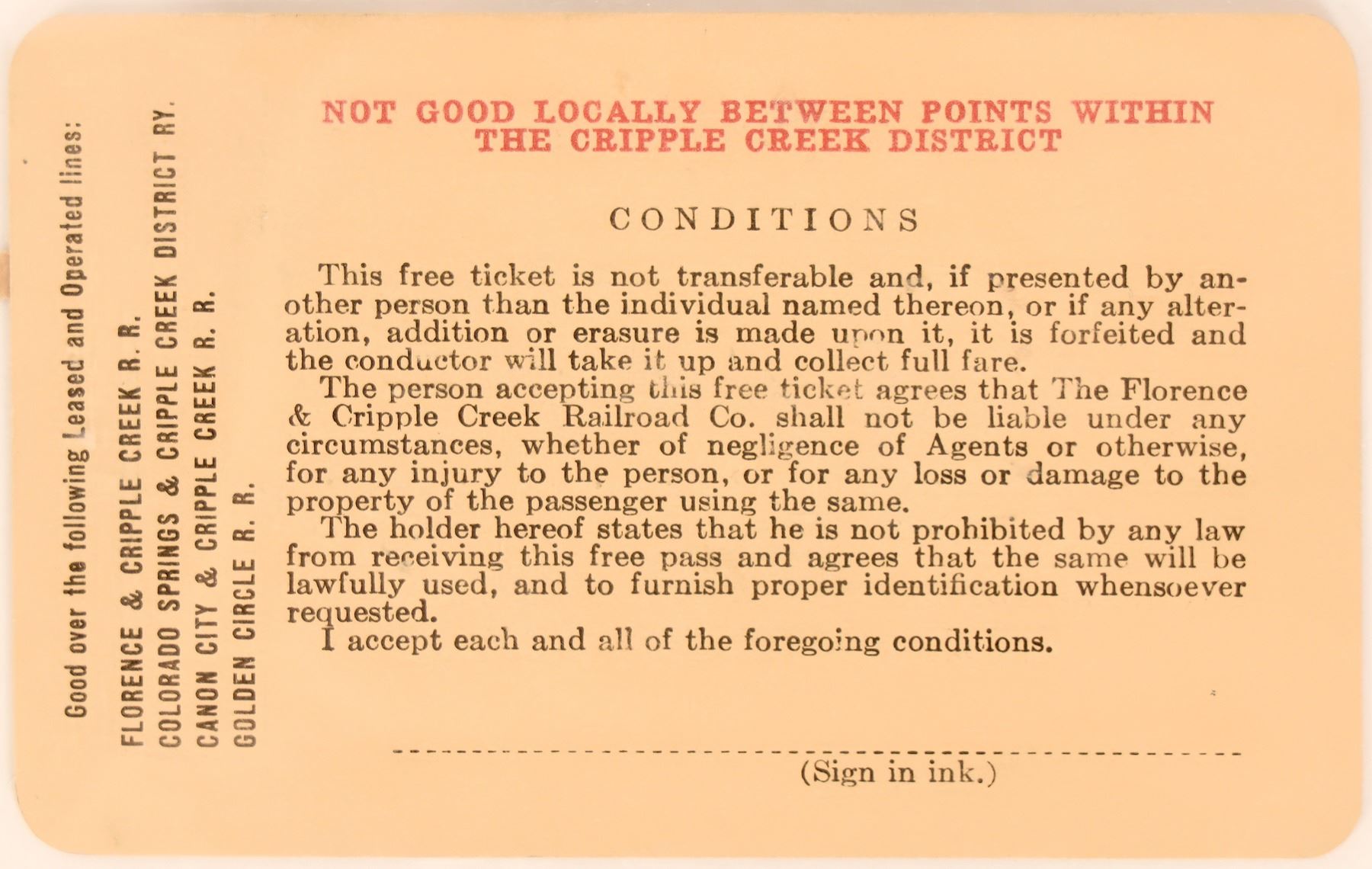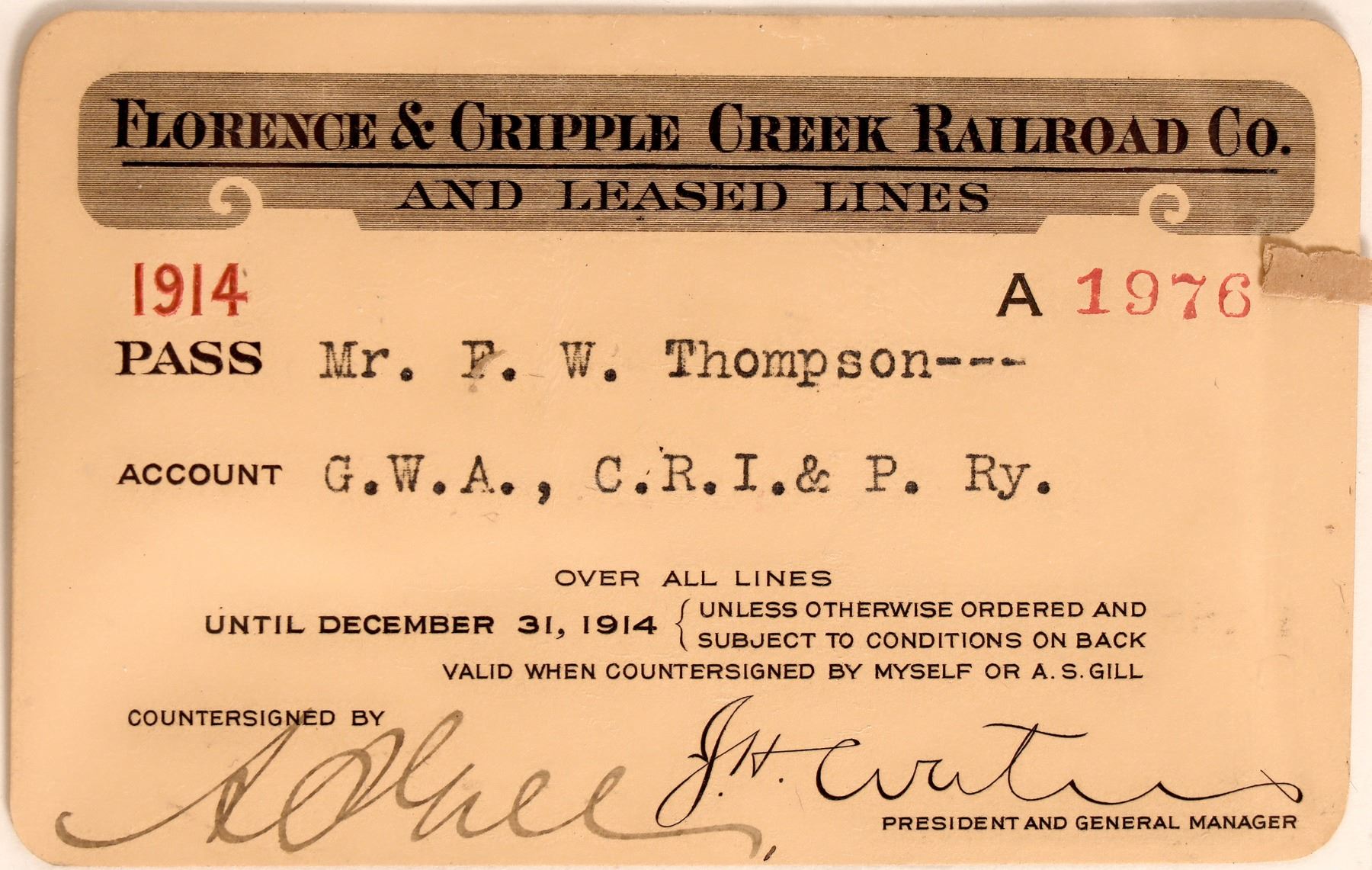 #A1976 issued 1914 to F W Thompson, Over All Lines, CRI&P RY, signed pres/GM, brn cards stock, title in shadow box, unk printer. Incorp 1893, first RR to mining towns. Abandoned in 1915. [] [Colorado] [] [] [Ron Lerch Collection]