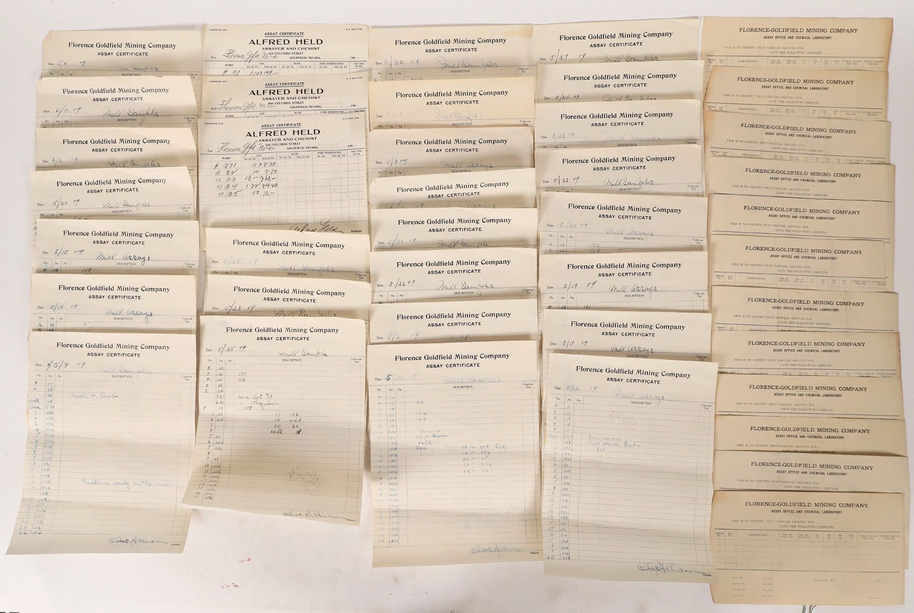 The Florence was and still is the key gold producing mine in Goldfield, NV. It is one of the early discoveries well discussed in Zanjani's book "Goldfield". This archive contains about 25 pieces of sampled "outside" the company by Alfred Held, and the rest are from internal assay lab results. While most samples are well below 1oz/ton, a few are exceptional, and may represent concentrates as over 60oz/ton is very good. The internal assays are from ores mined and mill results. Goldfield Nevada Franklin Collection