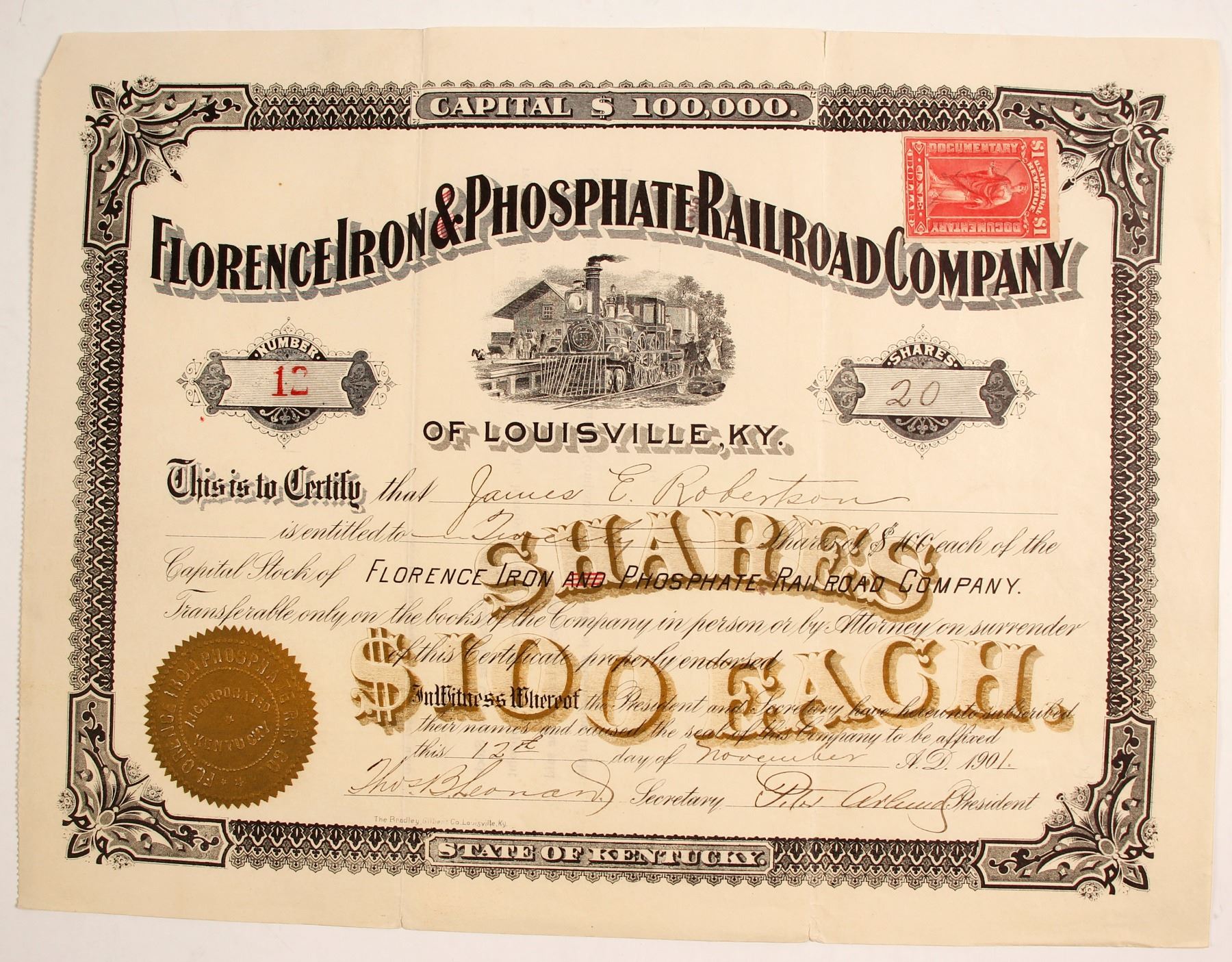 Twenty shares of uncancelled stock from Florence Iron & Phosphate Railroad Company, number 12 to James E. Robertson with revenue stamp.