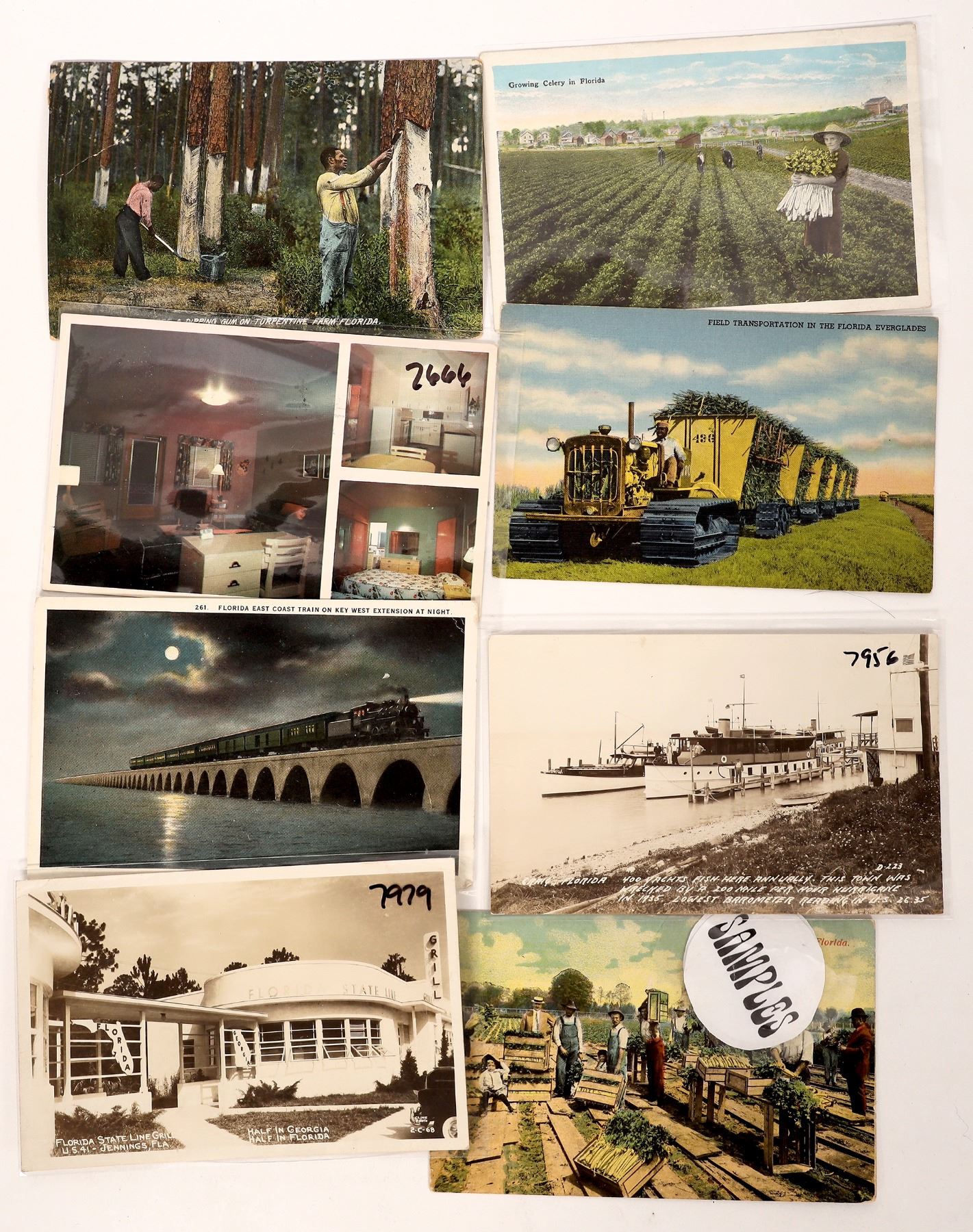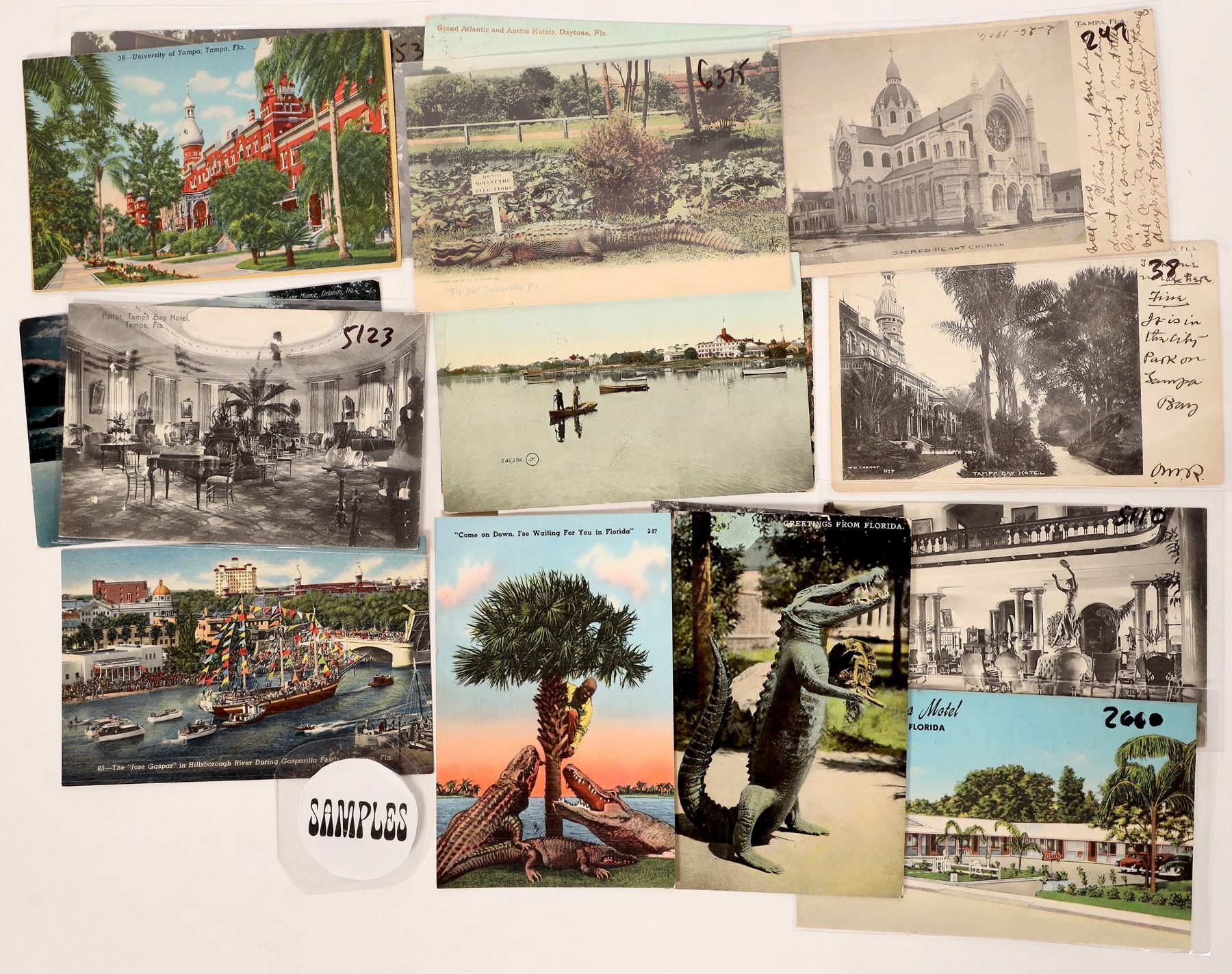 A collection of 100+ general subject postcards of Florida includes, five Pioneer cards, 10 RPCs, some pre-split back, mostly lithographs, c1906-53. Most are scenery and landmarks, some buildings and people. Some are canceled, some blank.