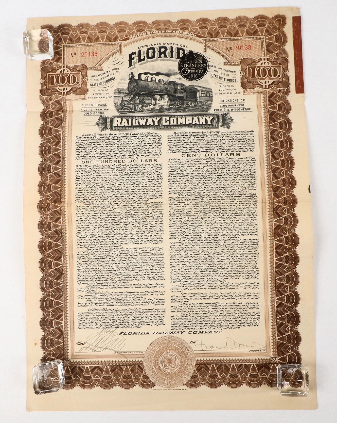 $100 gold bond issued in 1909. Text in English and French. Signed by the president and assistant secretary. Not cancelled. Brown border, black print, and locomotive vignette. Security Bank Note. Coupons attached. Tear on right border. Not listed in Cox.