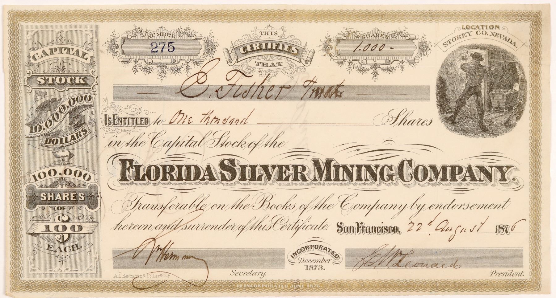 Rare American Flat mine. Storey Co., Nevada (printed at upper right). Inc. Dec. 1873. No. 275, issued for 1,000 shares to E. Fisher on Aug. 22nd, 1876 in San Francisco. Signed by president EW Leonard and secretary Lucien Herman. Not cancelled. Gold border, black print, oval mining vignette. Printed by AL Bancroft, SF. Folds, light wear. 5 x 9.5" The Florida was located in southern American Flat. It was originally called the Pony Express and was located in 1859. Work in the 1860s included a tunnel 500 ft. into the hill which encountered low-grade ore. The Pony Express Co. spent $100,000 in development but only yielded $20 in ore! In 1876, a shaft was sunk to 460 ft. A flood of water was encountered when they hit the ledge, but machinery was put into place. [Annual Mining Review and Stock Ledger, 1876, pg. 47] Ken Prag Collection