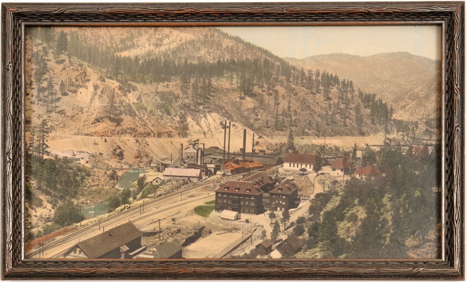 Rare hand colored photo of a mill near train tracks at Floriston, CA. 6.75x10.75".