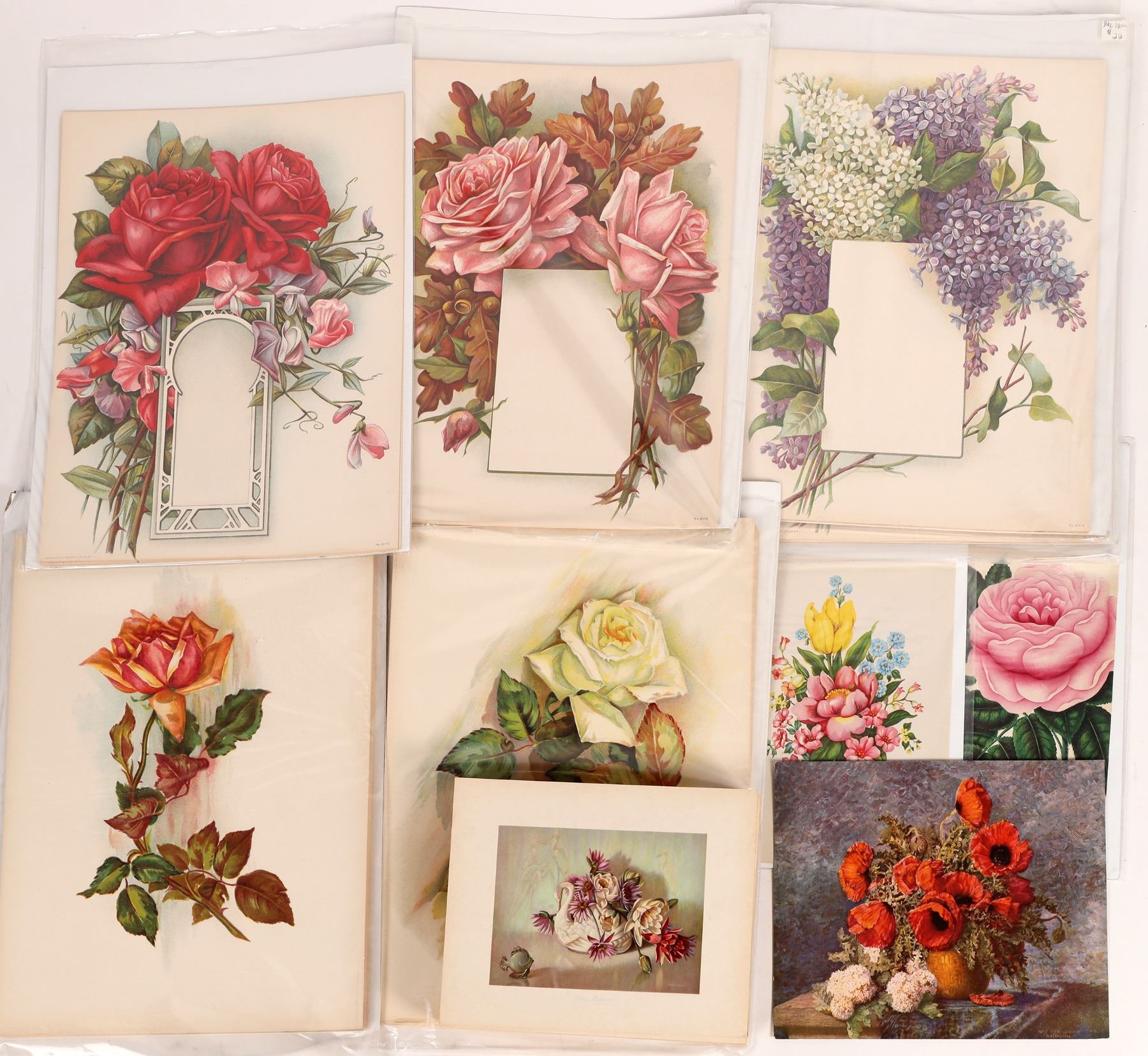 About 200 flower art prints. About 100 Lilies Moderne, 6x8". About 40 Gray Litho c. 1910 purple flower 12.7x". About110 other c. 1910 Gray Litho rose prints, 12.75x10".