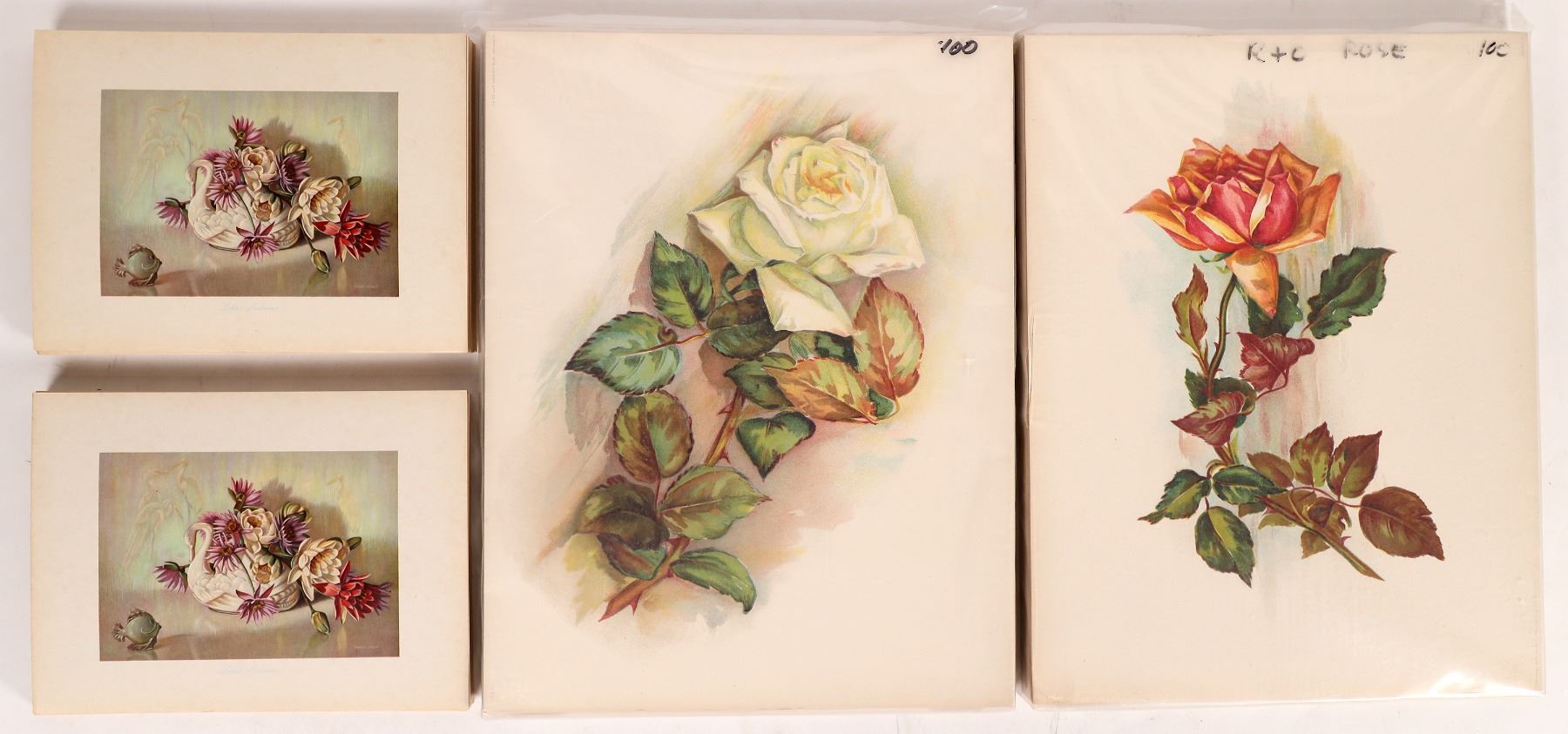 About 300 flower art prints. About 100 each-Gray Litho white and yellow roses, 10.75x10". Lilies Moderne, 6x8".