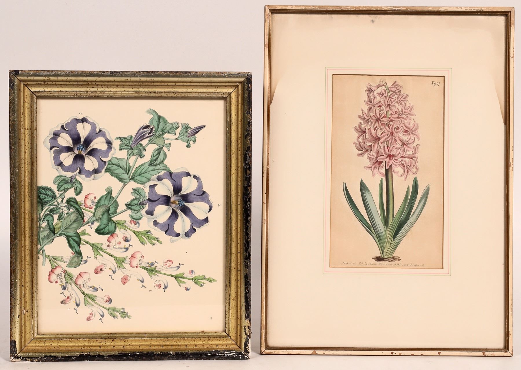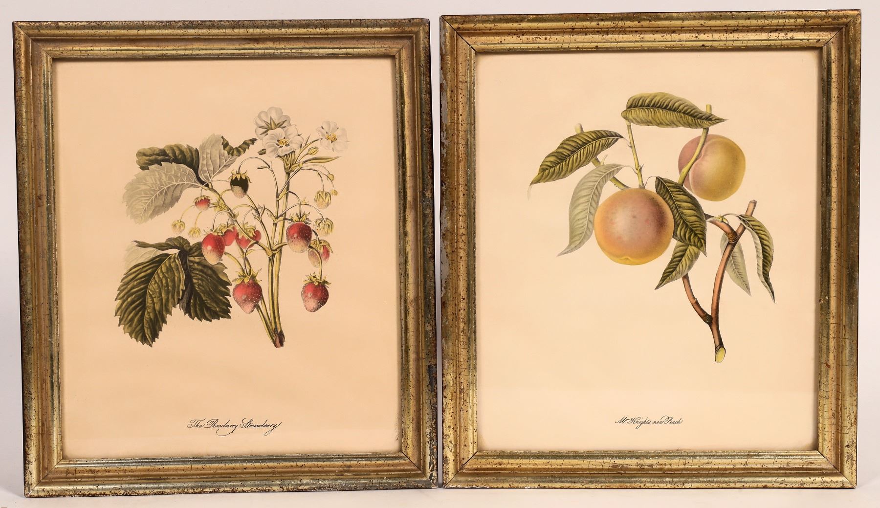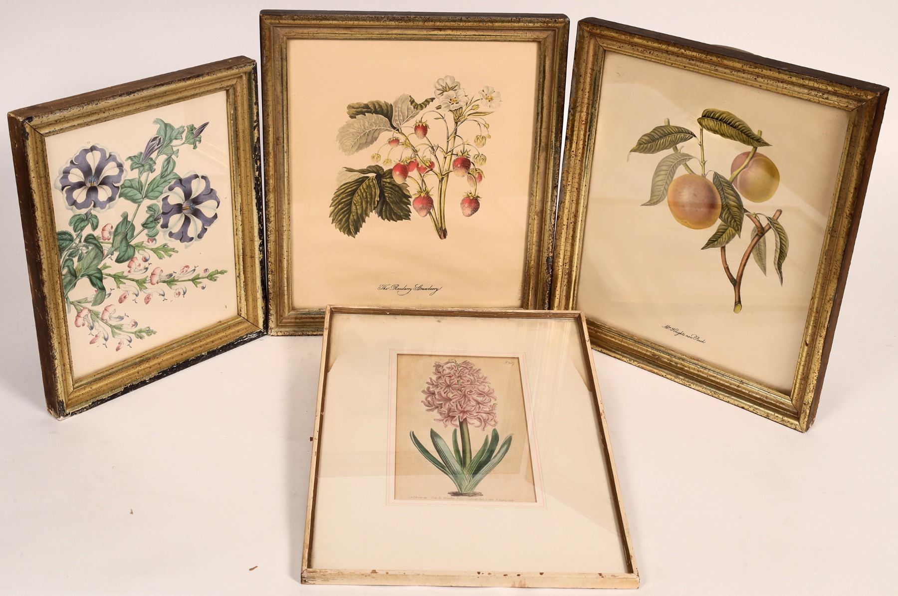 4 antique framed flower and fruit prints. Violet flower and more 9.5x11.5". Peach 13x11.5". Strawberry 13x11.5". Vertical plant with pink top 14x10", mat stained.