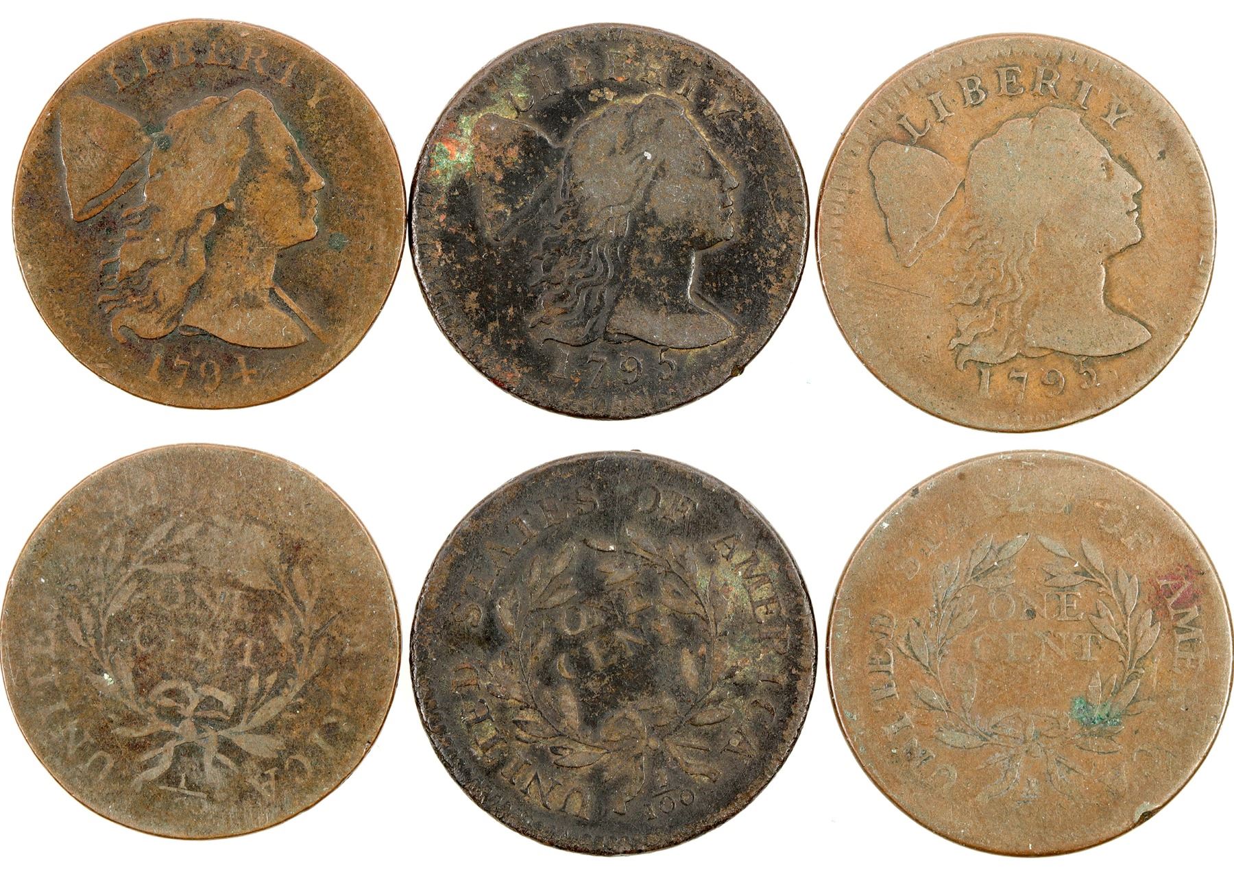 Lot of three Flowing Hair Large Cents: 1) 1794 head of 1794, G-VG condition; 2) 1795 plain edge, AG-G; 3) 1795 plain edge, G-VG.