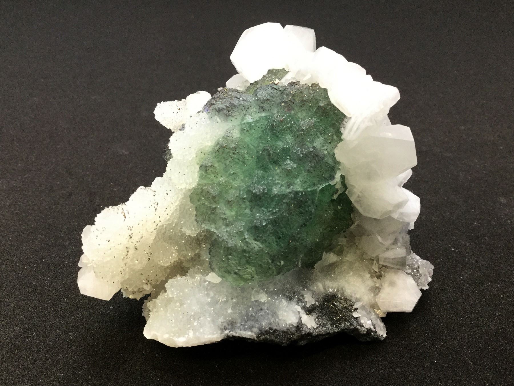 A brand new occurrence for fluorite in Fujian Province, China. This attractive specimen features a complex cluster of greenish fluorite crystals having a late-stage growth of purple fluorite as a near surface color-zone. In association are tabular, hexagonal crystals of white calcite which have been partially overgrown with a surface coating of sugary-texture quartz. A very pretty specimen. Dimensions (cm): 5.8 H x 8.8 W x 8 D. Minor repair that is unnoticeable to lower right region. Location: Longyan Prefecture, Fujian Province, China City: State: China Date: