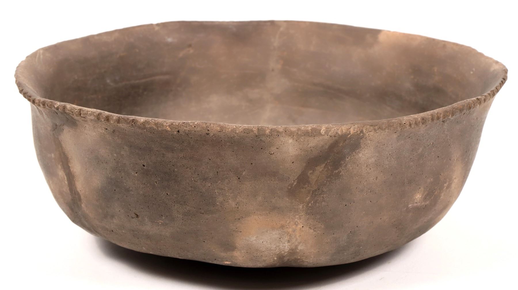 Ancient Caddo large bowl with gently fluted rim. Repaired crack. 3.5"x10.25". No apparent chips. Texas Gary Bracken Collection