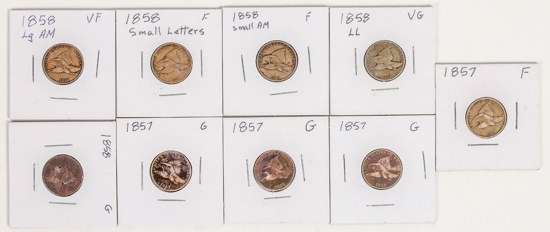 Nine Flying Eagle Cents: 1857 (4: 3 G; 1 F); 1858 (5: G, VG, F (2), VF).