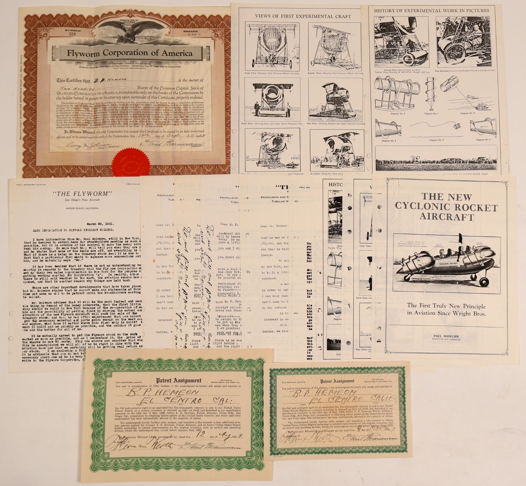 Lot of 3 items plus photocopied historical background. 1) Stock certificate No. 328, issued for 200 shares to BP Hemeon on Sept. 19th, 1929. Signed by president Paul Maiwurm and asst. secretary Perry M. Johnson. Not cancelled. Brown border and background, red seal, eagle vignette. Printed by Goes. 10.5 x 12.5" Folds. 2) Two Patent Assignment forms also issued to BP Hemeon for 1/1000th interest to Patent Rights "on a certain invention in Aircraft." Both forms signed by Paul Maiwurm as inventor. Company address is 756 Ventura Blvd., Mission Beach, San Diego, CA. The supplemental photocopied background information is written by Maiwurm and titled "The New Cyclonic Rocket Aircraft; The First Truly New Principle in Aviation Since Wright Bros." Photocopies show different views of "The Flyworm." Also photocopied letters about Maiwurm selling patent rights, stock shares, etc. The letterhead describes the aircraft as having "propulsion and sustaining action combined by means of rotating tubular wing with helical fins on inside and outside." Ken Prag Collection