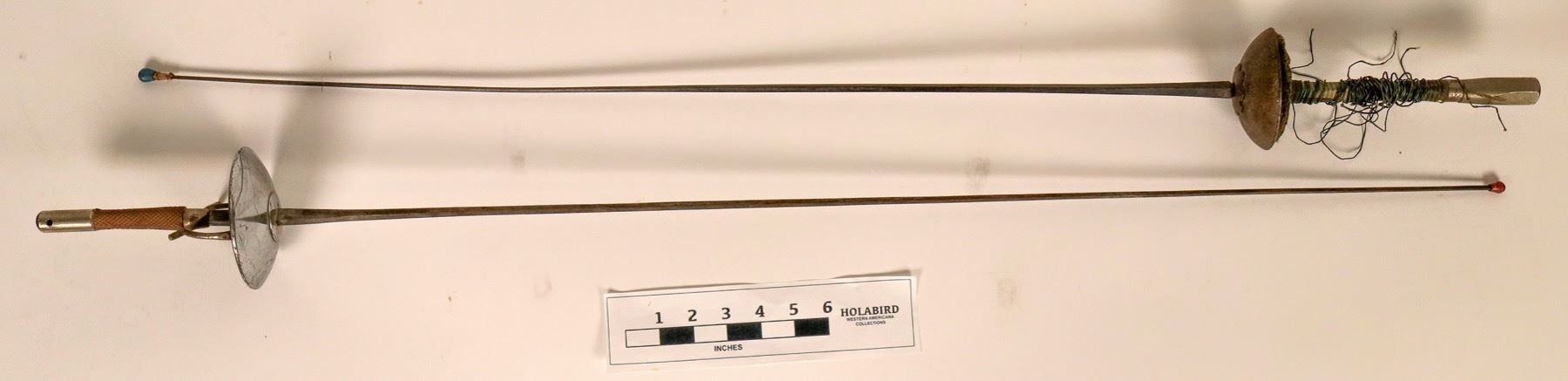 This is a pair of unmatched foil fencing swords. No manufacturers markings and there is no provision for electricals. Both appear to have been used and cared for with the typical square foil blade, rubber cushion, shield and grips. One line wrapped grip is in disrepair. Please see photos for details.