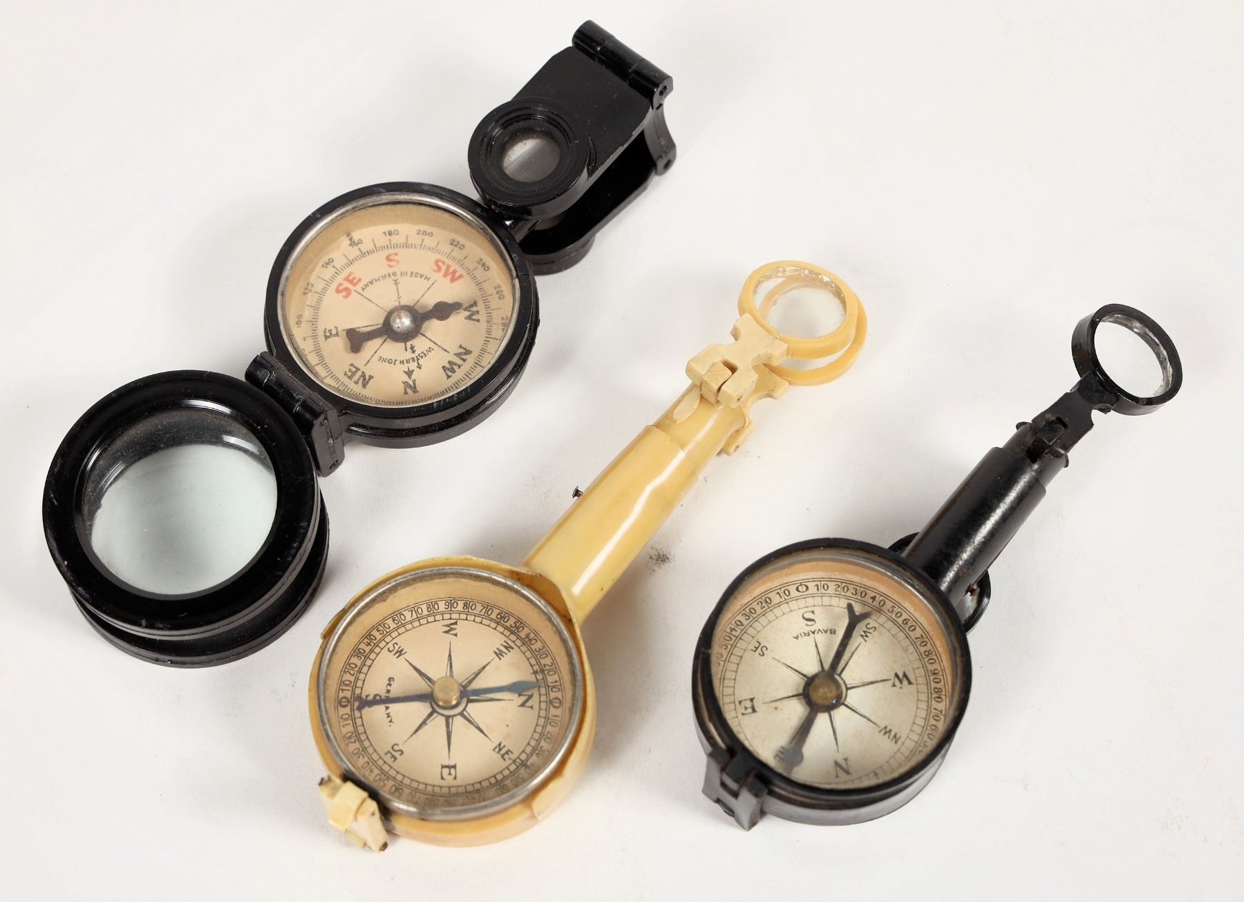 There are three combination opera glass and compass tools in this lot. One compass is complete with original box. This unique device can be used as a reading glass, magnifier, telescope, eye mirror, a stereoscope and compass. One unit is as is condition, the other two are very good condition. From the Popovich collection. Please see photo for details.