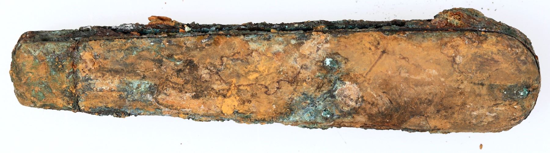 Folding pocket knife with 2 wood handles, l largely present, one side degraded. Metal blade partially degraded. Pivot pin and metal end caps present. 3.5x.75".