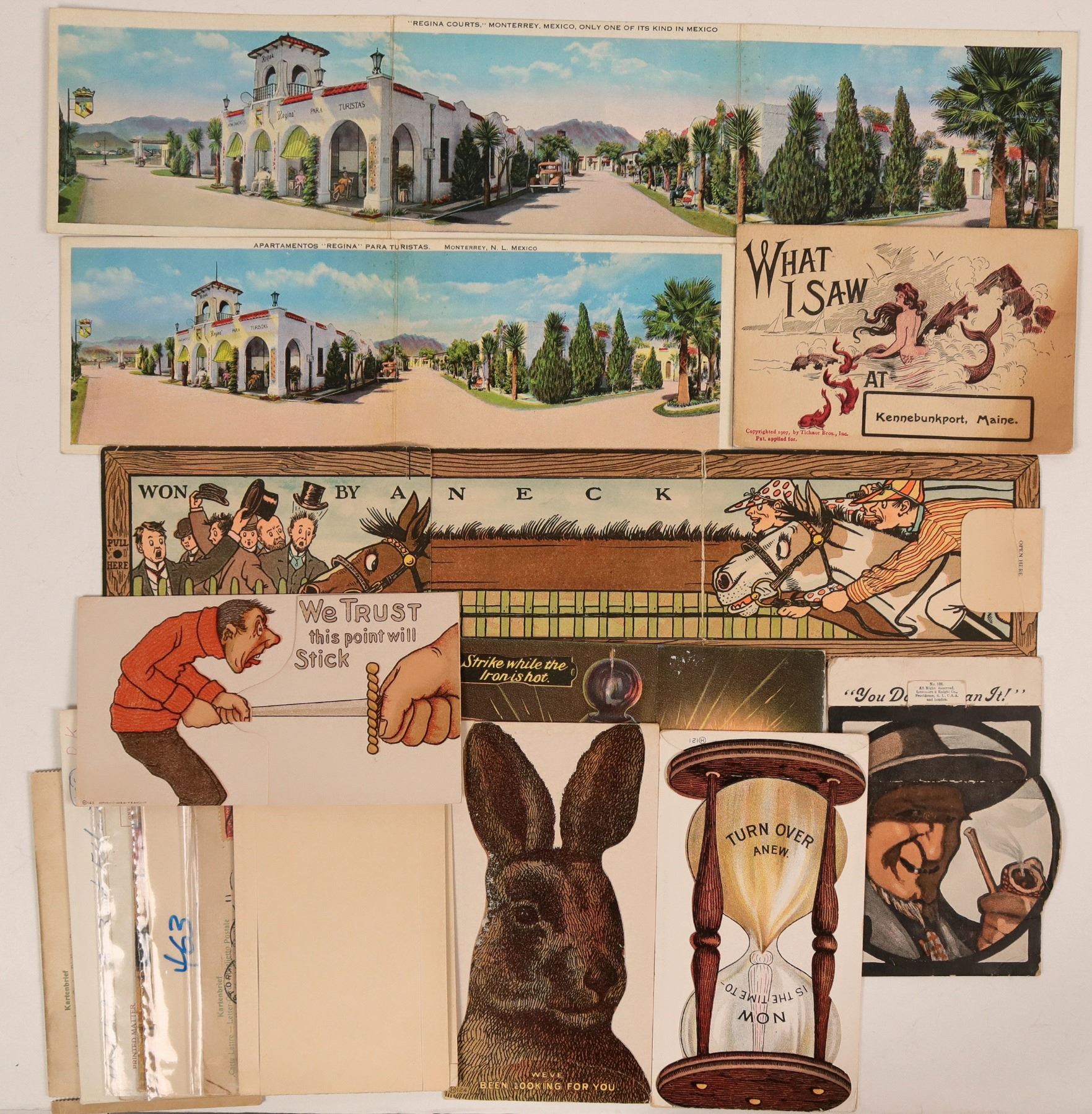 Nice lot of various subject matter postcards that foldout, or pull out. Many are humorous in nature. Includes five souvenir postcards. Features a beautiful butterfly foldout card, as well as a cute stork and baby foldout card. The highlight is a pullout card of a woman pulling what appears to be her tongue, but is actually her gum. See photos.