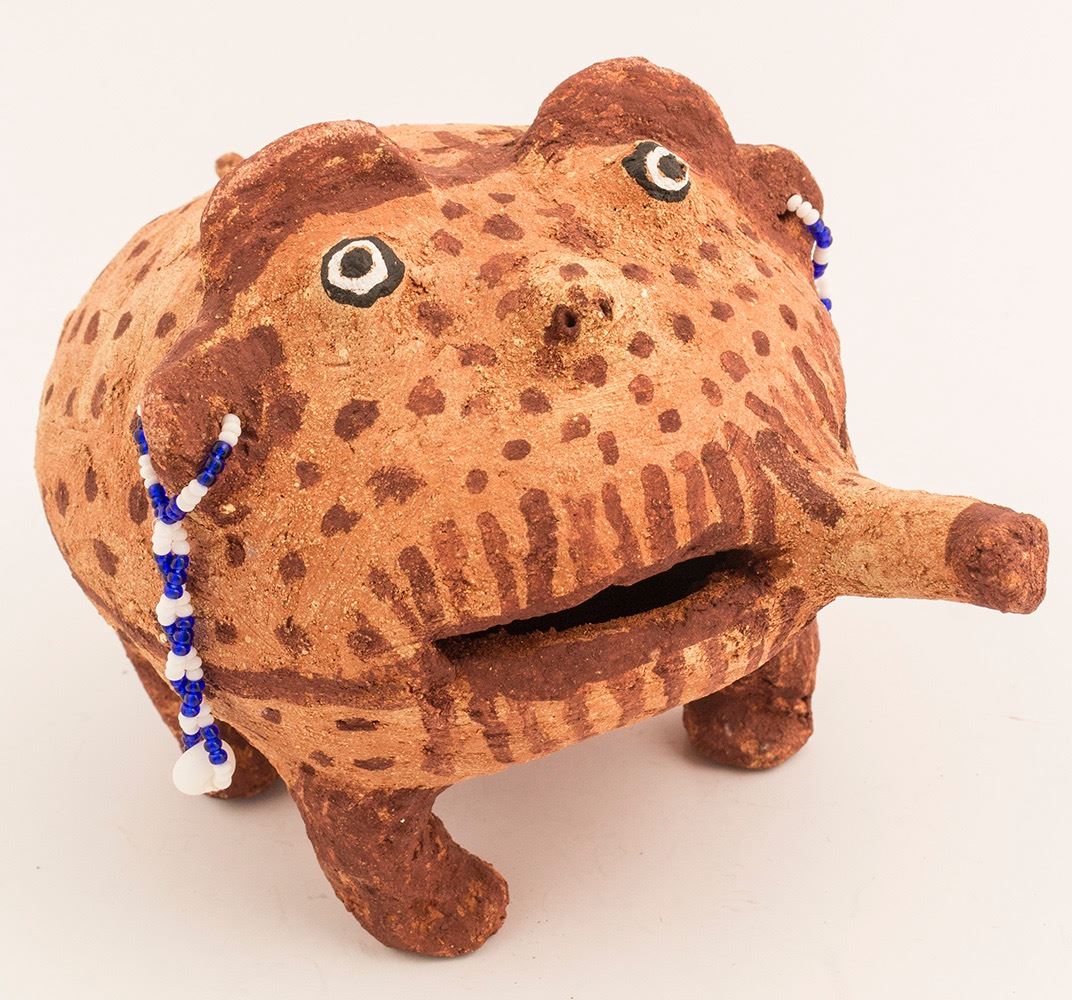 Strange folk art animal, smoking a cigar! Beaded earrings. Probably made by a child, charming. 4.5" x 6.5" x4.5". Date: Location: Laguna Pueblo, New Mexico HWAC # 49333