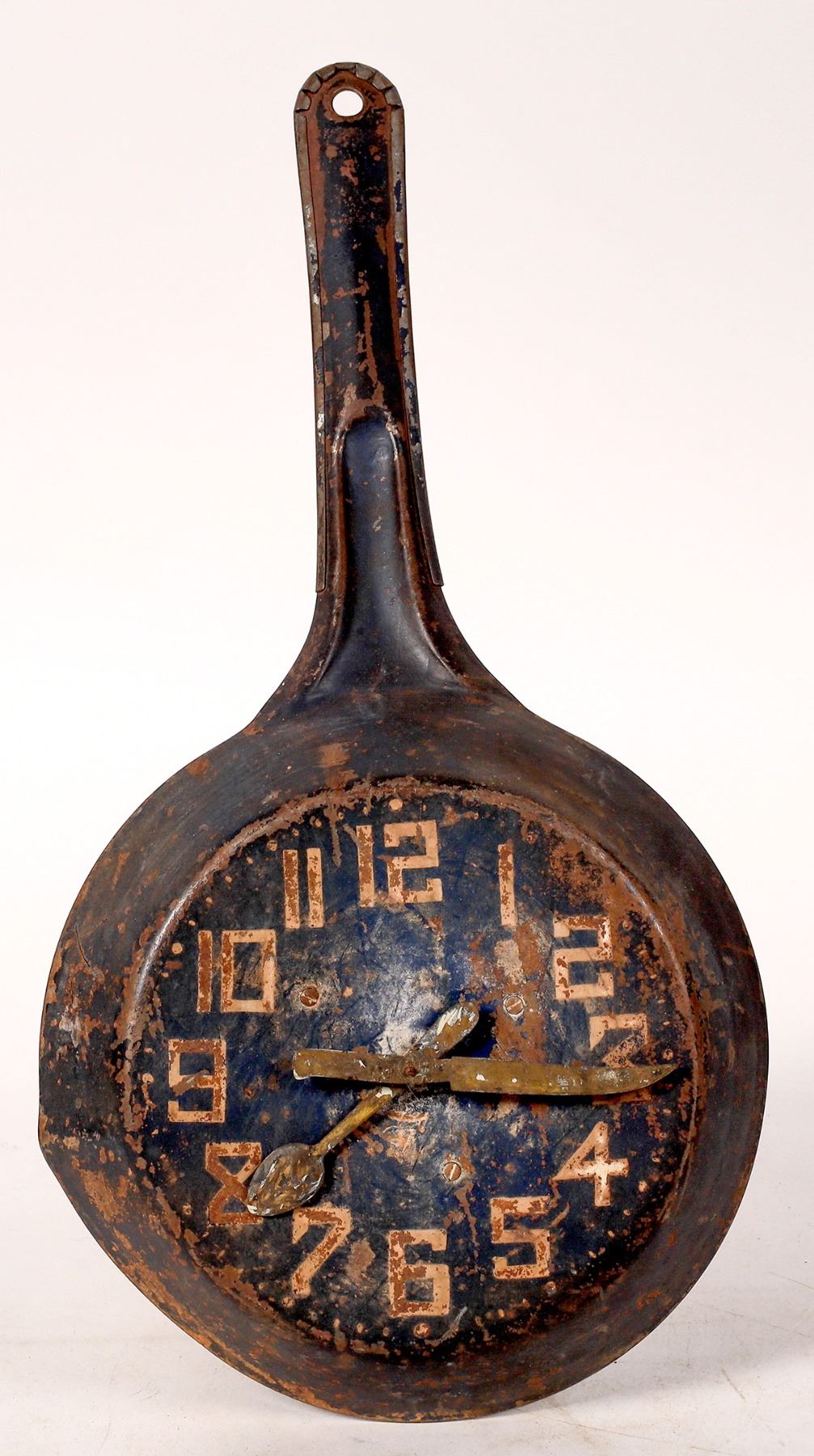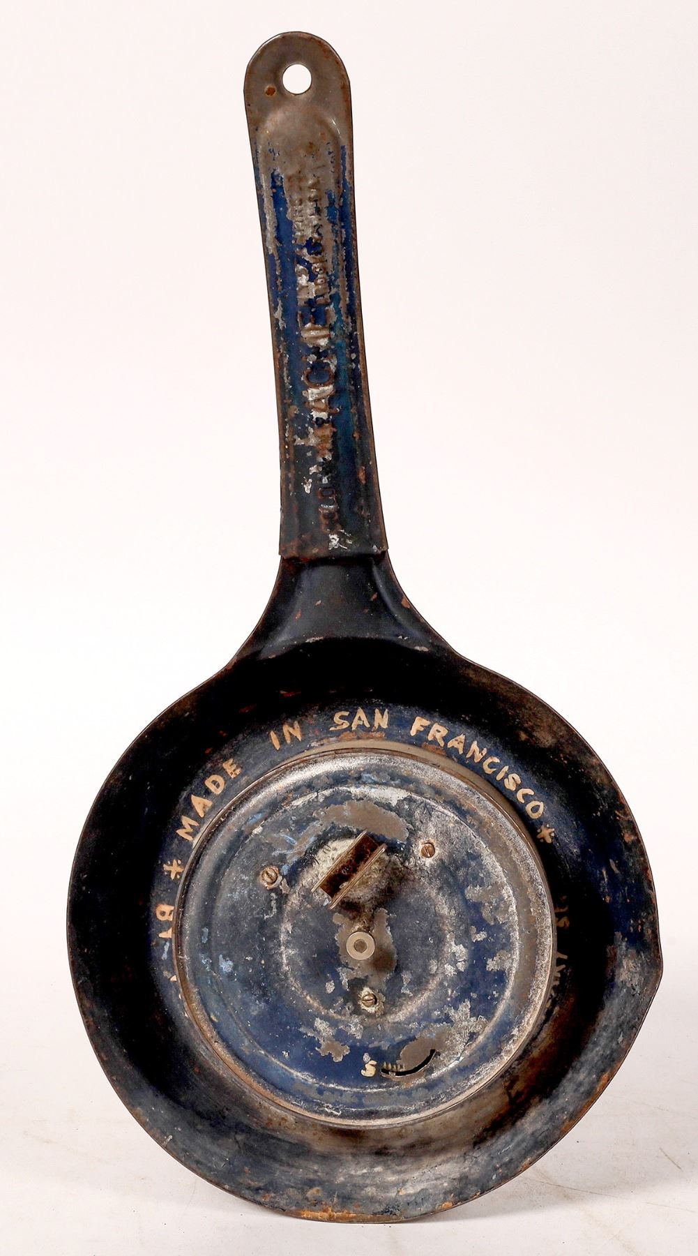 Very cool folk art metal skillet wall clock with spoon and knife like clock hands. Marked on inside of skillet "Made in San Francisco/By P. Olivier Watchmaker 5443 Geary St". 15.5x7.75".